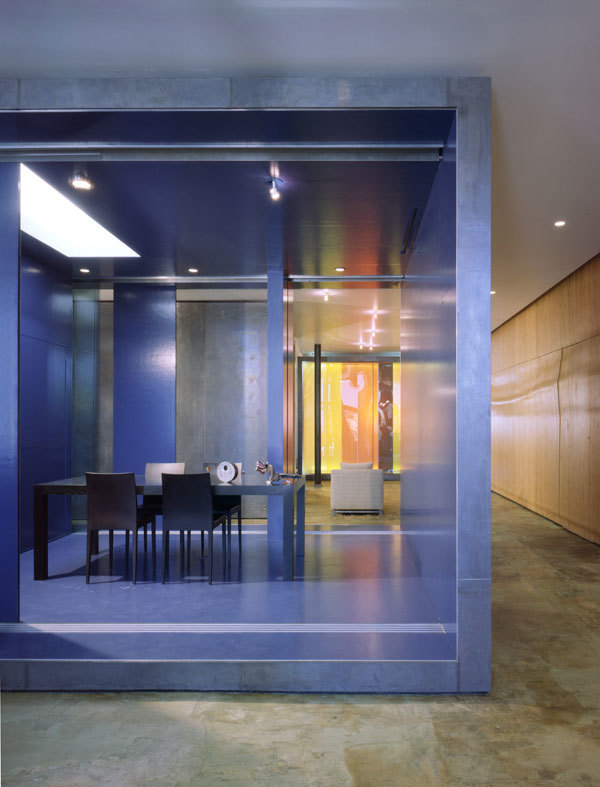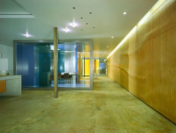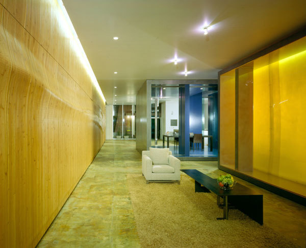 In contrast to the carving method of the wood construction, 1/8" colored acrylic panels were layered to a thickness of 1" for the facades of the adjacent lead lined offices. The panels are backlit from large skylights located within the interior of their respective offices and are transformed into a material of considerable spatial dept and color. The movement of light and people engages and activates the entire space, creating a quality of time and movement. Light is also used as an ordering device: drawing you into and through the space. It is a register of the passage of time as well as a social connector. As in the construction of the wood wall the acrylic panels reveal the extraordinary from within something very ordinary.