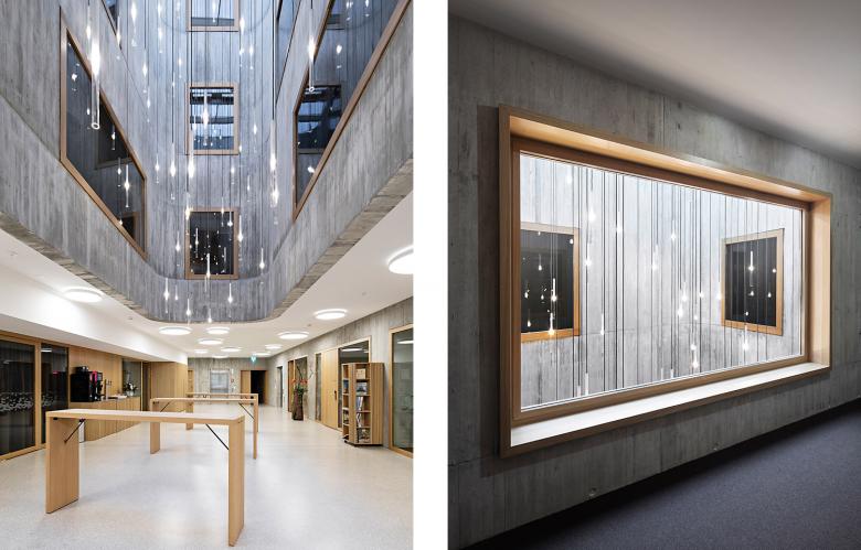 Die Demenzwohngruppe im 1. Obergeschoss verfügt über einen Demenzgarten in Form einer Dachterrasse. Die grosse Gebäudetiefe wird in ihrer Mitte durch einen Lichthof durchstossen. Die zwei Pflegewohngruppen pro Geschoss entsprechen, mit ihrem gespiegelten Layout, einer zeitgemssen Konzeption einer Pflegewohngruppe.