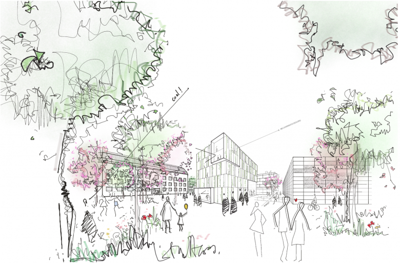 Der großzügige grüne STADT.PLATZ als ENTREE des Campus ABK und der WHS bietet Raum für Skulpturen, Folie ́s, Ausstellungen und anderen Aktionen im Freien und gegebenenfalls kleineren Pavillonbauten. So sollen Ausbildungsinhalte der ABK und KUNST im öffentlichen Raum in der Stadt sichtbarer werden.