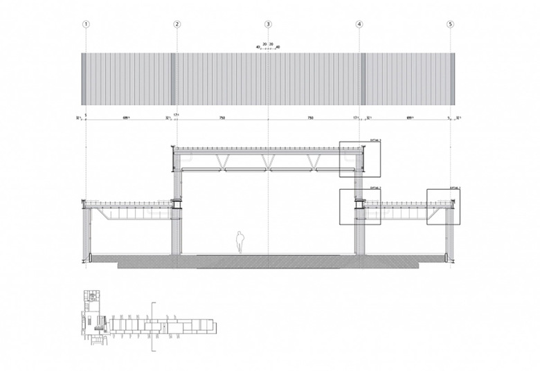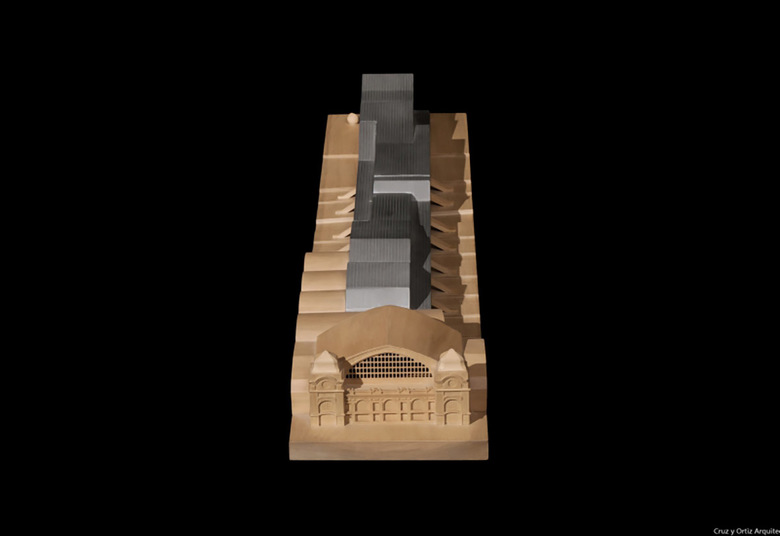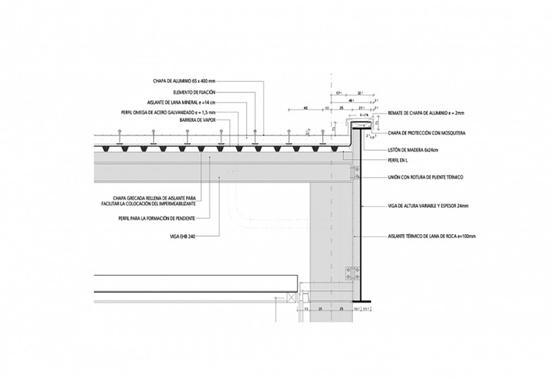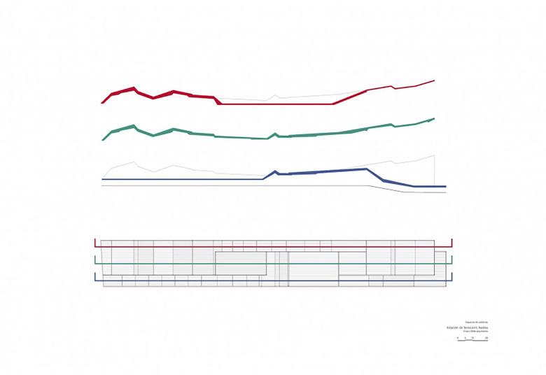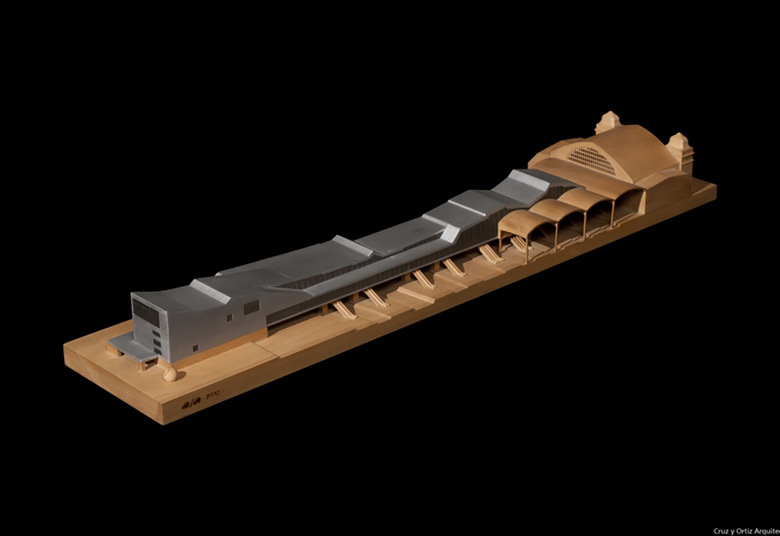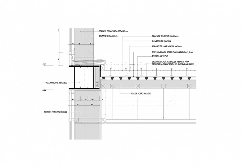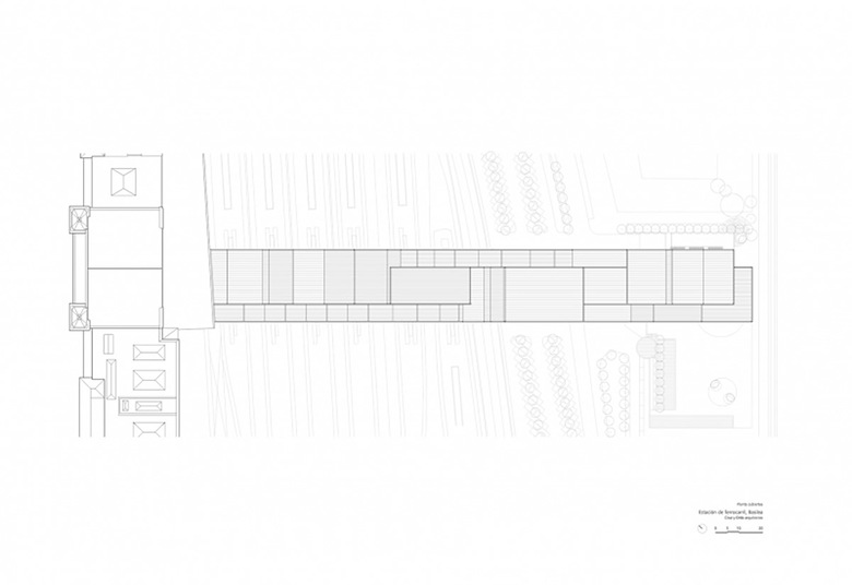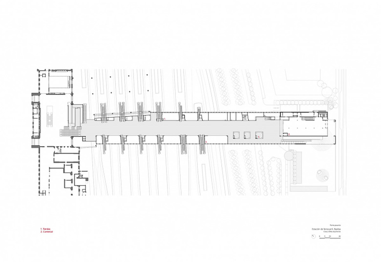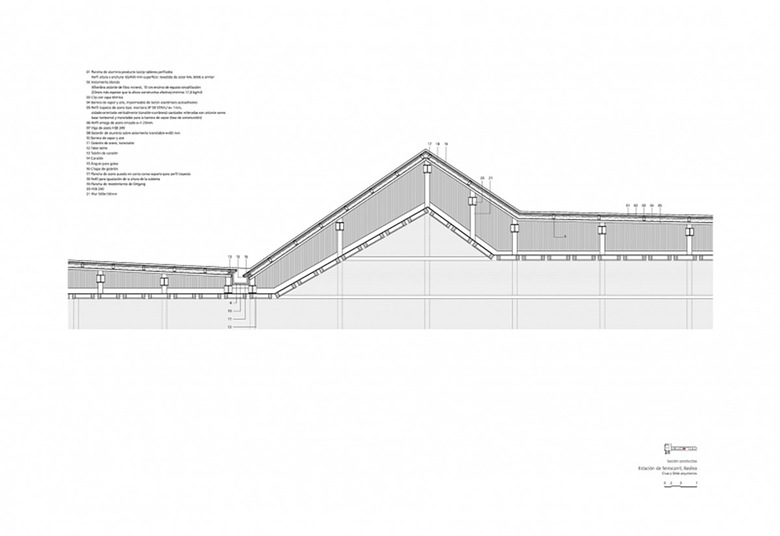 funcionamiento de la estación. Una losa de hormigón fue construida en el extremo Sur y posteriormente desplazada sobre los andenes a un ritmo de un andén cada tres semanas. La inclinación de los paños de la cubierta -quebrados hasta definir un perfil casi topográfico- proporciona a cada uso una altura específica, facilitando el acuerdo con las marquesinas existentes sobre los andenes. Con este gesto se mantiene la continuidad de la secuencia espacial, transversal al tránsito de viajeros que caracteriza el proyecto y que culmina en un importante volumen de cabecera en el lado opuesto del vestíbulo existente y en una nueva plaza sobre un aparcamiento
