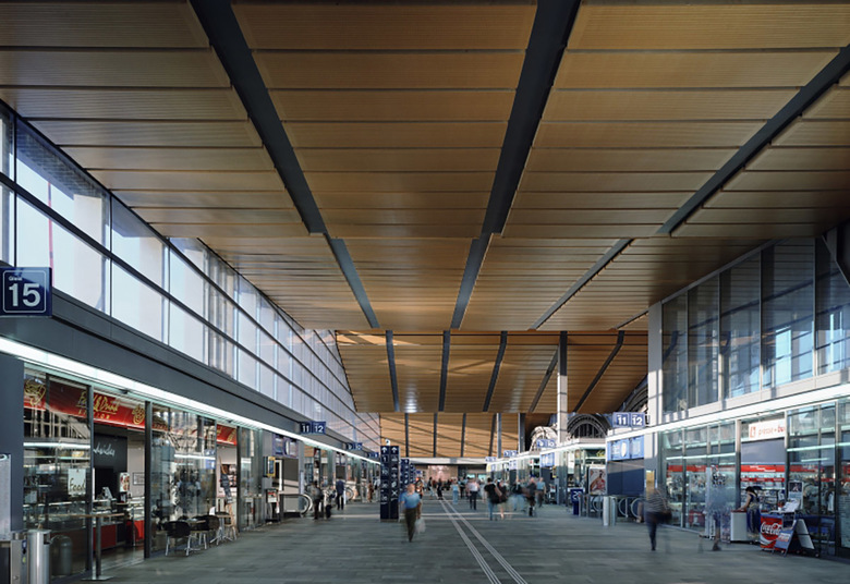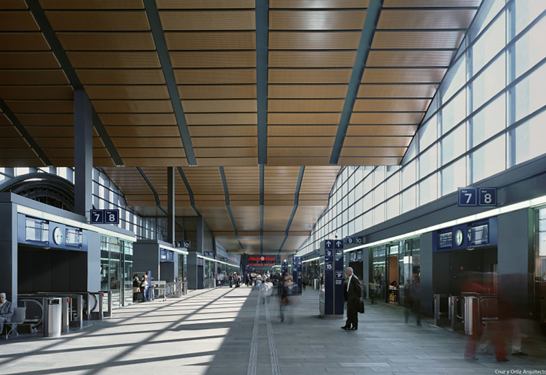 levado, una pasarela que alberga comercios y otros servicios, devolviendo al antiguo vestíbulo el protagonismo perdido. Visible desde varios puntos de la ciudad, la silueta de la cubierta es la principal responsable de la imagen renovada de la estación, que se presenta transversal al recorrido del tren como si se tratara de una estación término. La construcción hubo de hacerse sin interrumpir el normal