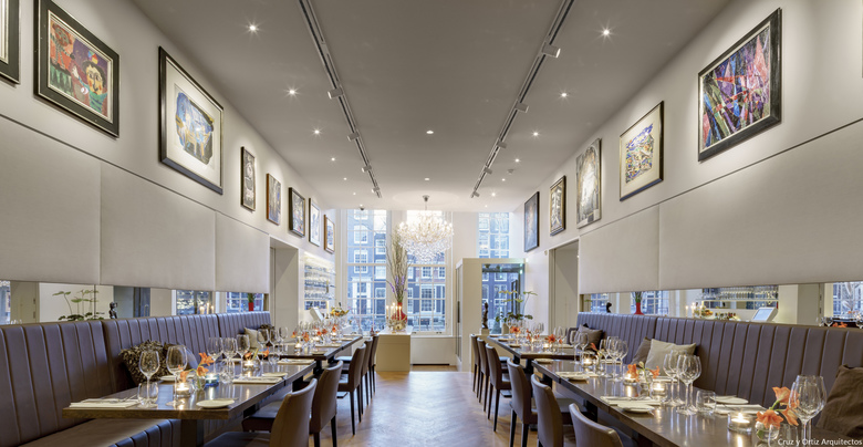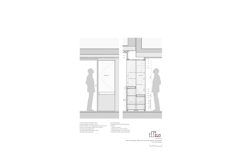 El primero de todos, que la muy relevante colección Cobra, propiedad del hotel, estuviera más accesible para los clientes. En segundo lugar, el Hotel Ambassade es visitado muy a menudo por escritores que suelen donar al hotel un ejemplar original firmado por ellos. Por este motivo, el hotel cuenta con una biblioteca de más de 4000 libros únicos. Por último, la creación de un lounge bar, lo suficientemente pequeño como crear un ambiente íntimo y una nueva brasserie (un nuevo restaurante) en la primera planta. Teniendo en cuenta la situación anterior, una de las primeras medidas a tomar era reorganizar los espacios. Algunas de las características especiales de las casas se habían perdido debido a modificaciones anteriores en el edificio, dando como resultado un espacio algo amorfo. La suma de decisiones inconexas tomadas a lo largo de los años ha supuesto una pérdida en la coherencia de la estructura original de las casas en el canal. Por lo tanto el primer paso era dotar a los espacios de geometría y claridad. La sucesión de pasajes alineados contemplados en la propuesta de diseño facilita el tránsito de una casa a otra, como un paseo a través de secuencias de espacios en los que uno puede reconocer de nuevo las casas originales. Al recuperar la orientación espacial, las zonas públicas del hotel se perciben de una manera más sosegada.