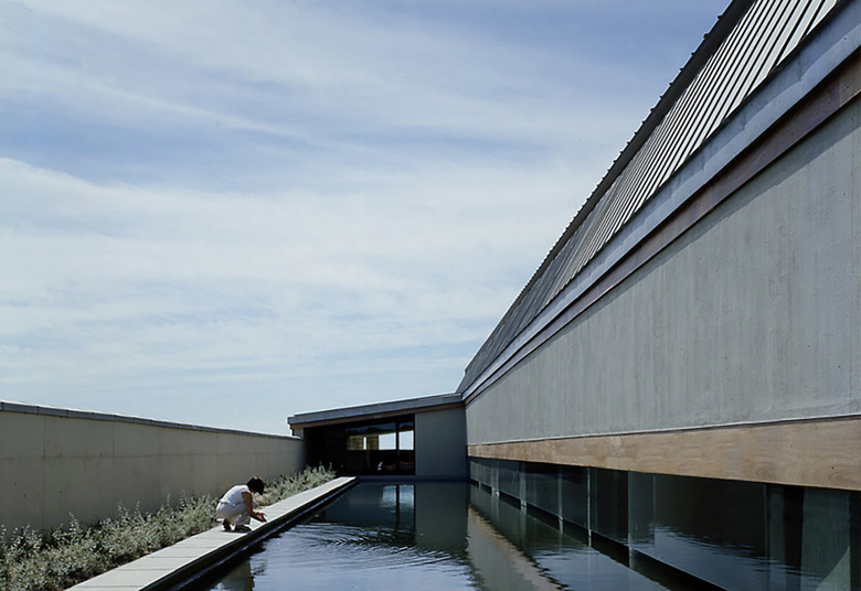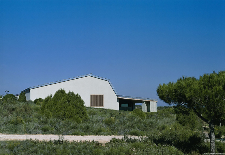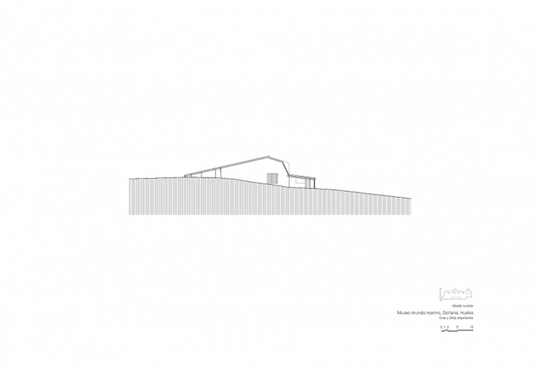 La diversidad funcional y formal de los distintos espacios que constituyen el Centro queda unificada por una cubierta que, con sus distintas pendientes, establece relaciones con el paisaje dunar circundante. La expresividad de la planta, al intersectarse con este plano inclinado, se manifiesta en la cubierta a través de una arista quebrada que dibuja el volumen del edificio.