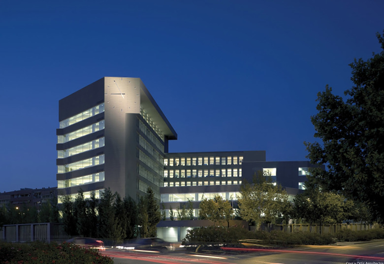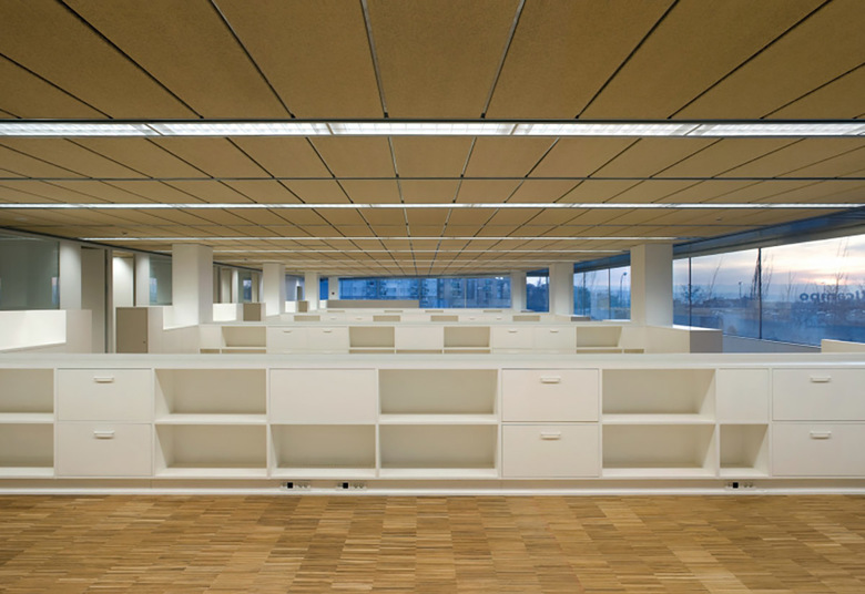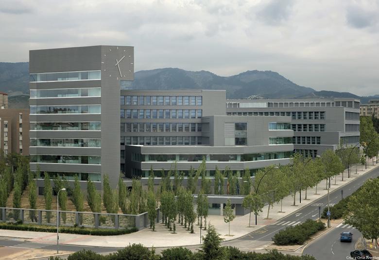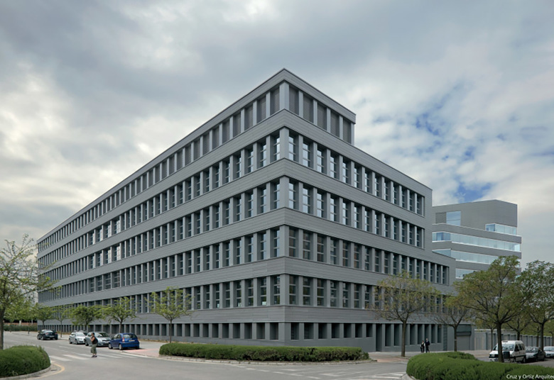 Al complejo se accede desde el sur y tras pasar controles y porches, se descubre el patio que constituye para el visitante un hallazgo inesperado. Desde el patio se alcanzan los distintos núcleos de circulación vertical. La influencia del espacio central y su valor organizativo alcanza incluso a la disposición de las oficinas en las plantas, al agrupar los despachos en torno al patio mientras las zonas externas, de geometría más irregular, vienen ocupadas por oficinas de organización abierta.