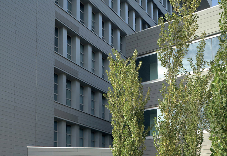 Las fachadas de ambos edificios han sido revestidas de placas de zinc y el conjunto es muy monocolor, en un gris que le distingue claramente de las edificaciones vecinas. Este afán por singularizarse ha llevado a instalar un gran reloj en el punto más alto del conjunto pretendiendo con ello afirmar y subrayar la dignidad de lo público en una zona de carácter tan periférico.