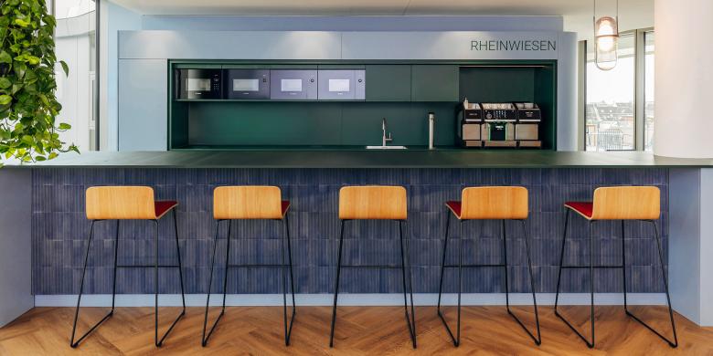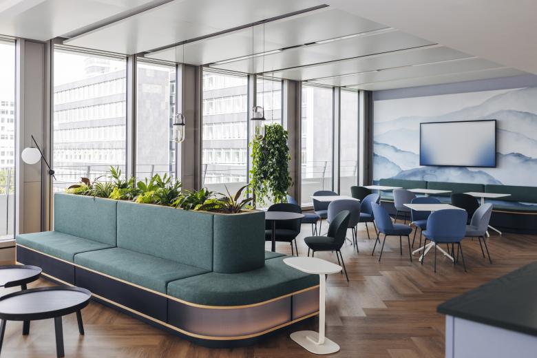 Das Herzstück des Projekts bildet das Work Café – ein vielseitig nutzbarer Treffpunkt mit zwei zusammenhängenden Bereichen, die durch einen lichtdurchfluteten Flur verbunden sind. Die Gestaltung ermöglicht eine flexible Nutzung: Das Work Café dient als Raum für gemeinsame Mittagspausen und Erholung, während es ebenso für Meetings, Events und informelle Zusammenkünfte genutzt werden kann. Beide Bereiche verfügen über einen direkten Zugang zu einer umlaufenden Terrasse mit einem weiten Blick über Düsseldorf – ein weiteres Highlight, das die Aufenthaltsqualität steigert. Tribünen, Lounge-Inseln und Bistro-Sitzgruppen schaffen ein abwechslungsreiches Ambiente, das Raum für individuelle Auszeiten ebenso wie für den inspirierenden Austausch im Team bietet.