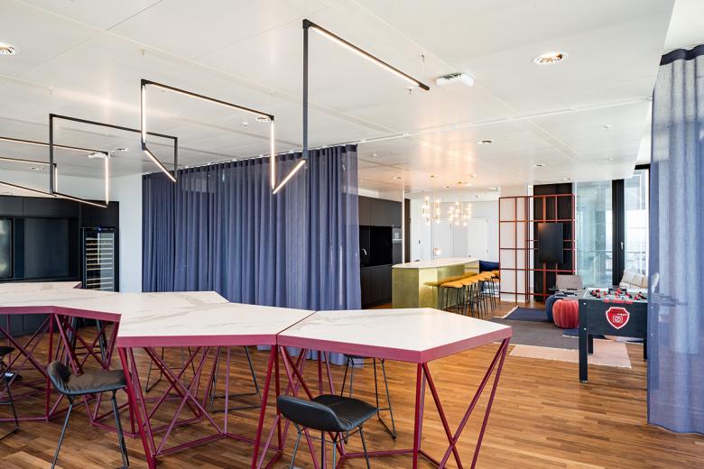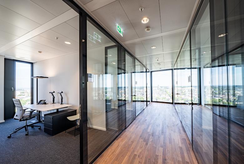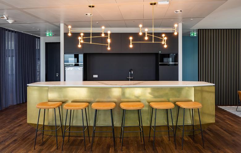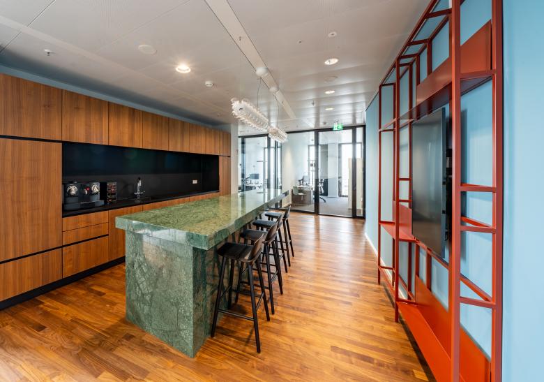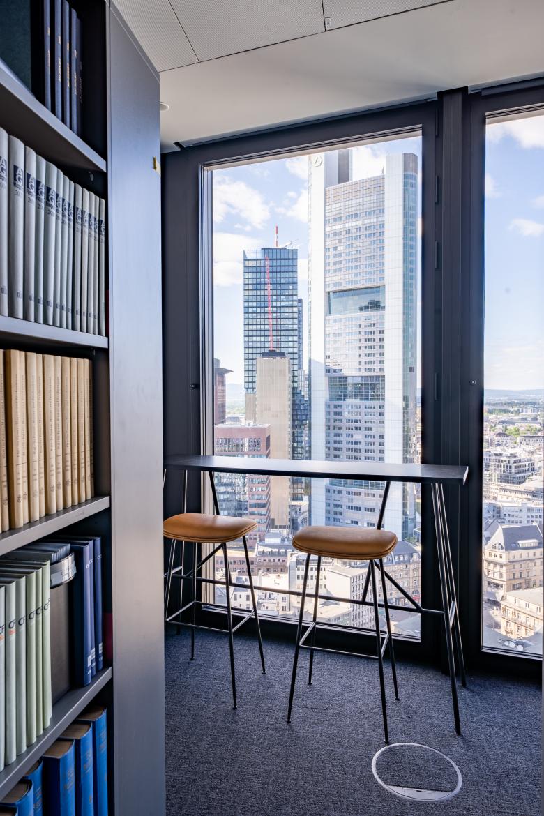 Auf Basis einer strukturierten Bedarfsermittlung suchten wir die optimale Mietfläche für die internationale Wirtschaftskanzlei und unterstützen zudem bei der Aushandlung des Mietvertrags mit dem Projektentwickler Art-Invest für sieben Etagen inklusive Dachterrasse im WINX – The Riverside Tower. Der 110 Meter hohe Turm umfasst eine Gesamtfläche von 42.000 qm und bildet mit seiner prägnanten Gestalt die Pforte zur Frankfurter Innenstadt direkt am Main. Mit seinem schmetterlingsförmigen Grundriss prägt das mit DGNB-Platin zertifizierte Gebäude das Erscheinungsbild Stadtquartiers. Dank der frühzeitigen Einbindung in das Projekt konnte das Team von CSMM die Gebäudestruktur bereits in der Planung anpassen und ein sehr offenes und agiles Raumkonzept entwerfen, das auf die Bedarfe der Mitarbeiter zugeschnitten ist und die Arbeitsprozesse des Unternehmens optimiert. Ein zweigeschossiges Foyer mit geschwungener Wendeltreppe verbindet den in den oberen Geschossen befindlichen Mandantenbereich. Der Treppenverlauf verjüngt sich nach oben und führt vom Eingangsgeschoss über die Konferenz-Etage bis hin zur Dachterrasse. Mit dem Ziel die interne Kommunikation zu fördern wurde in jedem Stockwerk eine Lounge eingerichtet. Zusätzlich dient einen große Mitarbeiterlounge im 27. als Gemeinschaftsbereich. Eine Treppe verbindet alle sieben Etagen und fördert durch kurze Wege und Treffpunkte den direkten Austausch der Mitarbeiter untereinander. Das insgesamt elegant gestaltete Interior bringt die moderne Architektur mit ihren offenen und weitläufigen Flächen perfekt zur Geltung. Mit der Auswahl edler Materialien für die Ausstattung wie Marmor und Holz entsteht eine repräsentative Atmosphäre.
