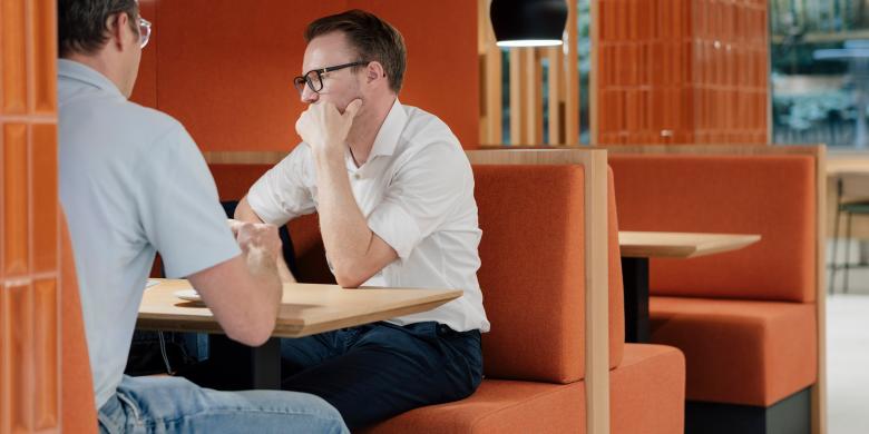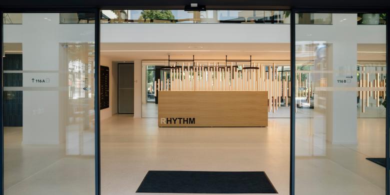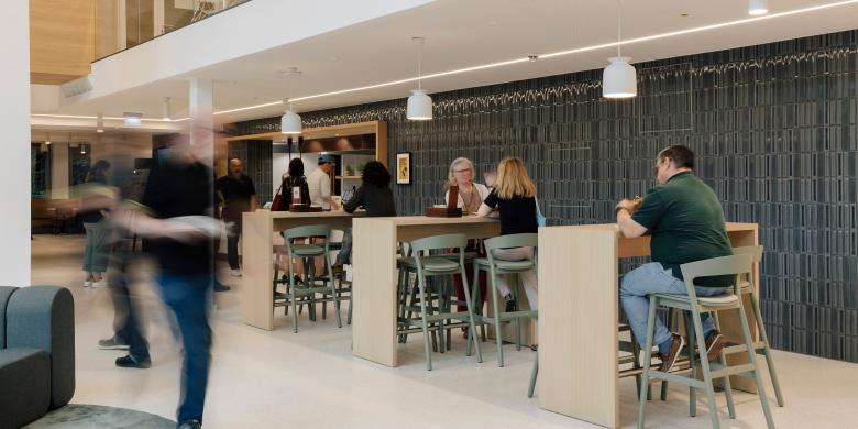 CSMM brach die Gebäudestruktur zweigeschossig auf und bezog ehemals ungenutzten in den neu geschaffenen Raum ein. Eine offene und helle Galerie verbindet den Eingang mit der neuen Mietfläche im Obergeschoss. Die ehemals kleinteilige Eingangssituation erweiterte sich zum großzügigen und einladenden Foyer, das sowohl Empfang für Gäste als auch Treffpunkt für die Mitarbeitenden der Firmen im Haus ist. Zentrales Element ist die breite Treppe aus hellem Holz, deren großflächige untere Stufen auch als Sitzbereiche genutzt werden können. Eine Barista-Bar stellt die Verbindung zum Gastrobereich her und die eingezogene Galerie schafft mit ihren loungeartigen Sitz- und Arbeitsbereichen neue Blickbeziehungen. Im Foyer stehen 57 mobile Arbeitsplätze zur Verfügung, in der neuen Kantine sind es 177. Sie versteht sich als Erweiterung der Arbeitsflächen in den Obergeschossen, die ganz im Sinne von New Work auch außerhalb der Betriebszeiten genutzt werden können. Auf einer Fläche von 520 m² statt der vorherigen 1.300 m² geht die gastronomische Fläche ins Foyer über und präsentiert sich mit differenzierten und abwechslungsreichen Raumszenarien und Möblierungen, fein abgestimmten Farben, Materialien und Oberflächen sowie einem durchdachten Lichtkonzept. Kleinere Kojen laden zum konzentrierten Arbeiten auch abseits des eigenen Schreibtisches ein.