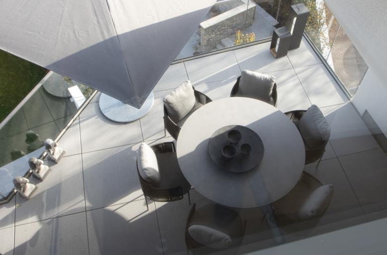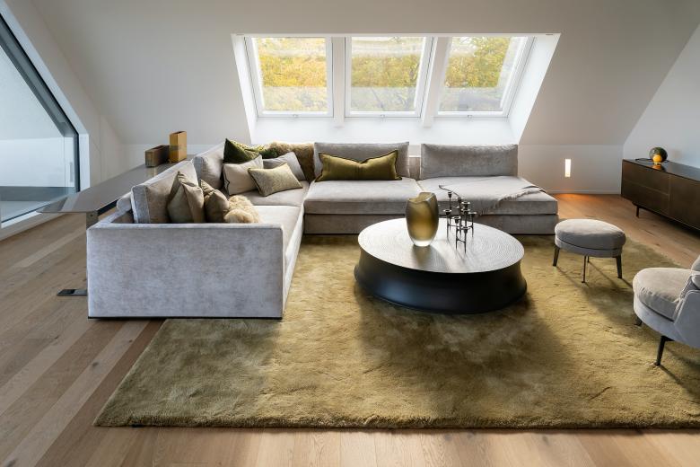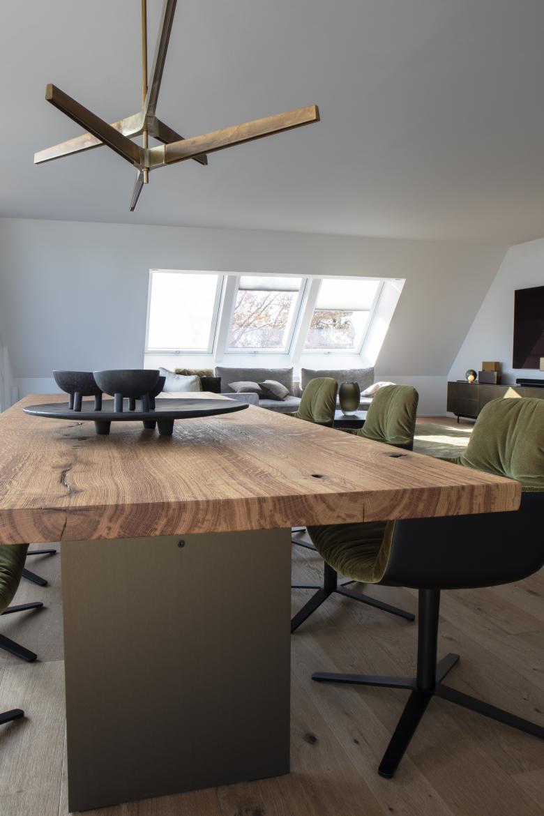 Was gibt es für einen Innenarchitekten Schöneres als eine „Carte Blanche“? Hoch über den Dächern der Stadt liegt diese Maisonette-Wohnung mit spektakulärem Blick; Küche, Wohn-, Ess-, Schlaf-, Ankleide- und Gästezimmer, Bädern, WC, Nebenräumen und großzügigem Außenbereich. Die frisch gebackenen Eigentümer beauftragten Cyrus Ghanai mit der Entwicklung des Gesamtkonzepts und dessen Realisierung inklusive Farb- und Materialschemata sowie der losen Möblierung. Um den offenen Charakter des Habitats eindrucksvoll zu unterstreichen, versetzte der Innenarchitekt zunächst den Küchenbereich im unteren Geschoss und konzipierte ihn komplett neu. Sämtliche Einbauten wie beispielsweise der Schreibtisch und der Kleiderschrank im Gästezimmer sowie der Schrank im Ankleidezimmer wurden passgenau entwickelt und mit einer exquisiten Oberfläche versehen. Kleines Highlight: die Neukonzeption und Realisierung der licht anmutenden Treppe, die sich harmonisch ins Ganze fügt. Bei der Entwicklung des Farbkonzepts griff Ghanai auf die Farbpalette zurück, die die Umgebung natürlicherweise bereithält. Grau changiert bisweilen metallisch bis Blassblau und Gelbtöne kräftig Oliv- bis Messingfarben, ergänzt um einige wenige Kontrastfarben. Bei der Auswahl der losen Möblierung lag das besondere Augenmerk auf hochwertigen Stücken, haptischen Stoffen und Strukturen.