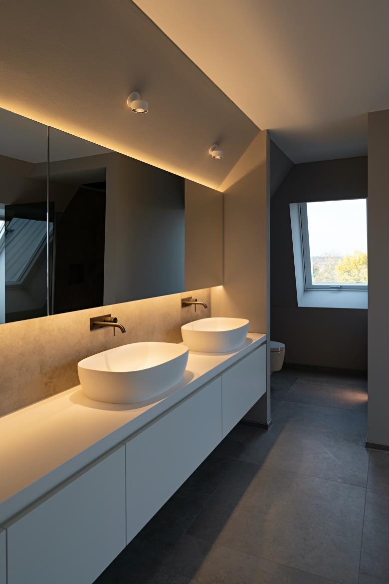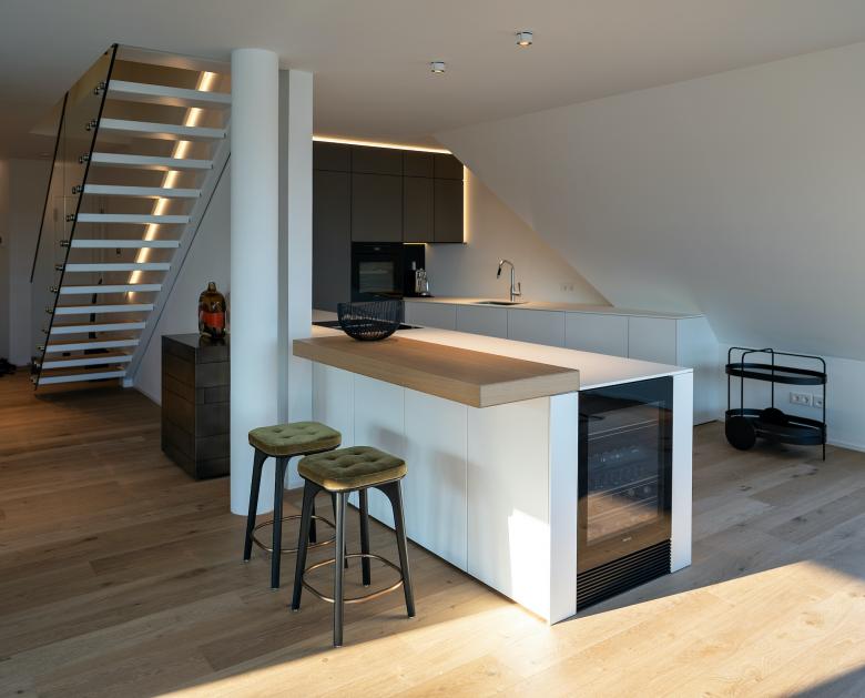 Konzept, Gesamtentwurf und Umsetzung von Küche, Bädern, Treppenkonstruktion, Material- und Lichtkonzept, lose Möblierung