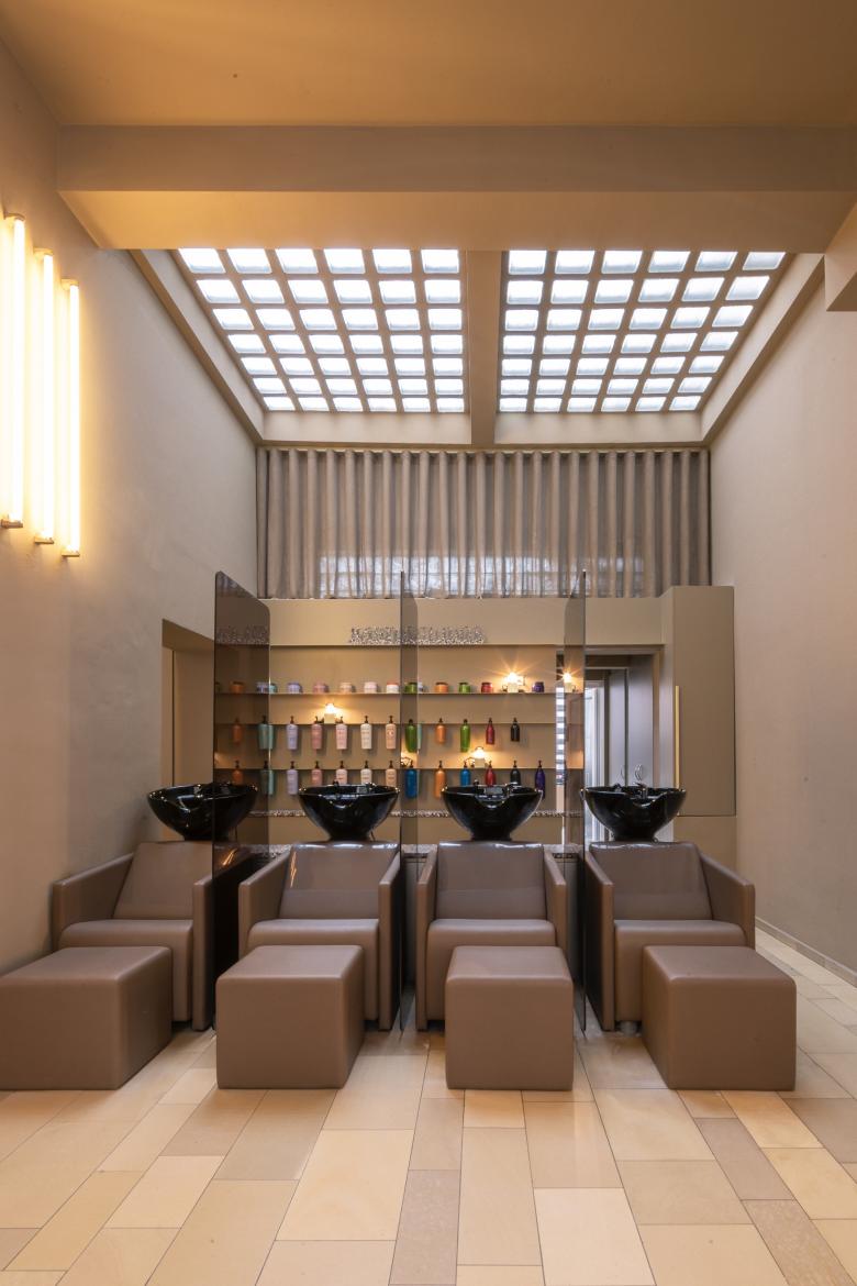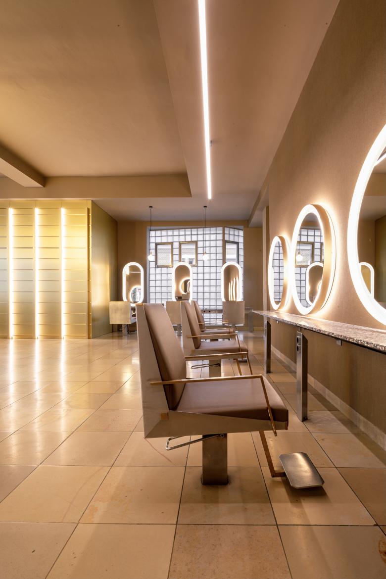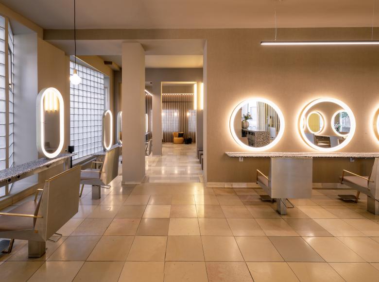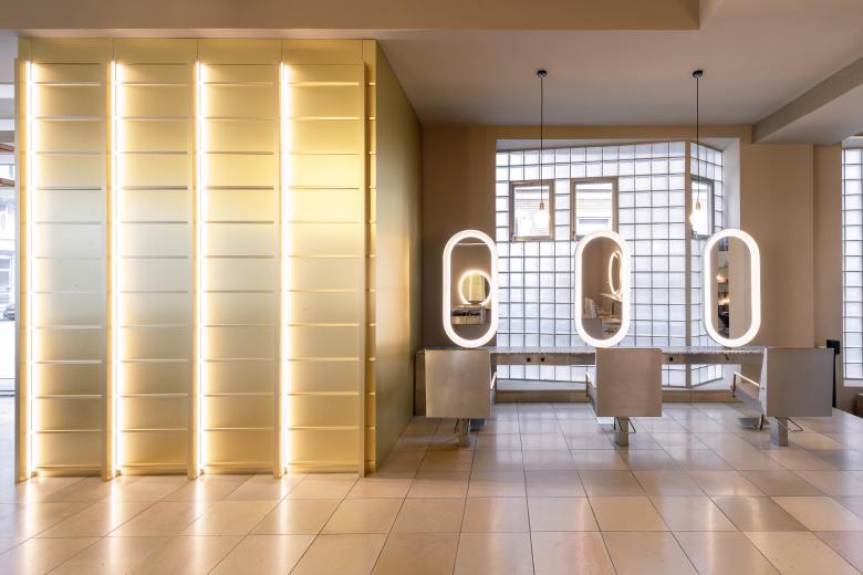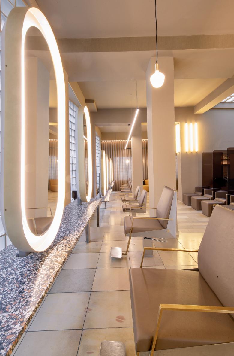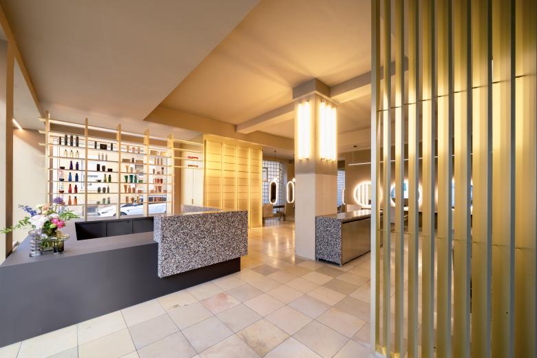 Charakteristisch für die von Cyrus Ghanai neu gestalteten Räume: große Fensterflächen, hohe Räume, ein Boden aus Solnhofer Naturstein und eine feste Möblierung in Form von Friseurstühlen, die der Designer Heinz Legler entworfen hatte. Ghanai öffnete den Eingangsbereich und schuf Platz für eine Theke und ein Verkaufsregal, das nahtlos in einen Schrank übergeht. Hauptthemen des Konzeptes: die Linienführung und das Material der Friseurstühle. Diese adaptierte Cyrus Ghanai auf das Design der Lichtbänder und der Wandbeleuchtung. Passend zur Farbgebung des Bodens ersetzte er die Glasablagen an den Arbeitsplätzen durch Terrazzo, der auch für die Empfangstheke und die Verkleidung der Bar verwendet wurde. Überdies entwarf Ghanai runde und ovale, beleuchtete Spiegel und strukturierte die Waschplätze neu. Für den hinteren Bereich entwarf er eine Bar mit Lounge. Highlight im Konzept: ein Schrank aus Echt-Messing-Laminat. Das verspiegelte und beleuchtete Möbel dient als Ankleide und „Social Media-Fotokabine“. Somit können Pflügers Kunden die neuen Looks direkt auf Social Media präsentieren.