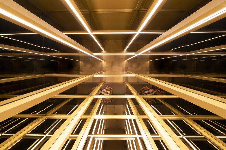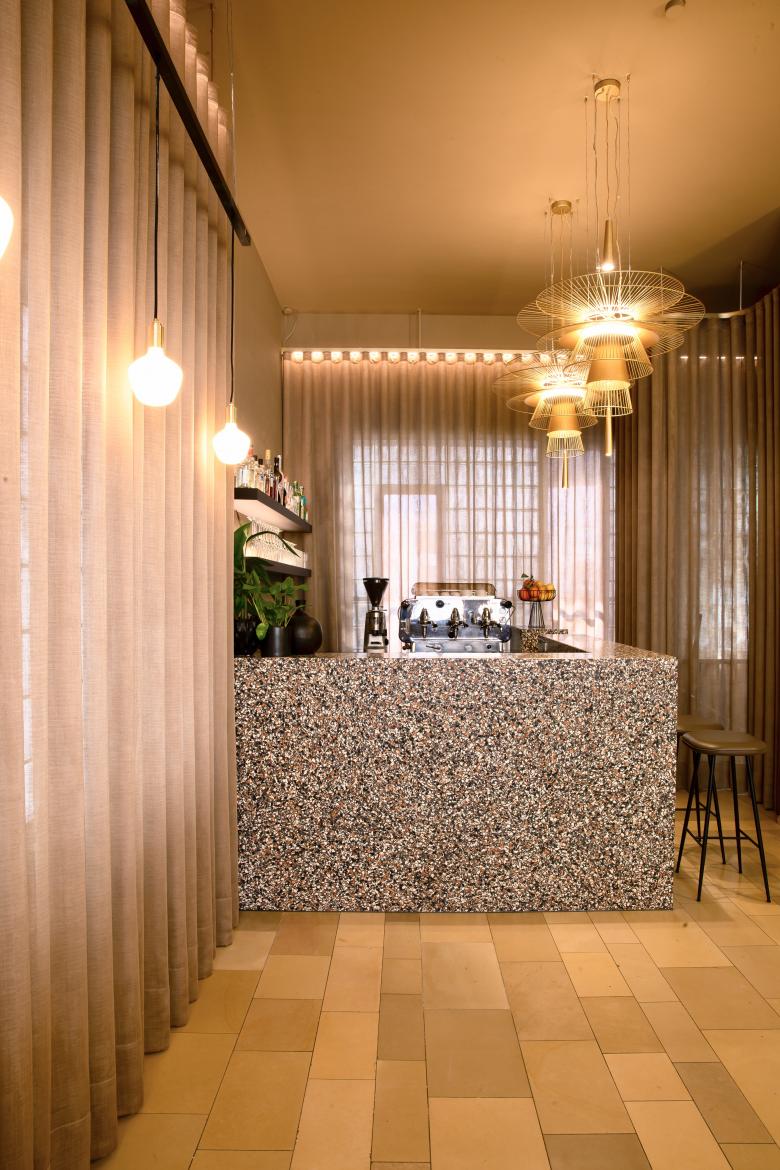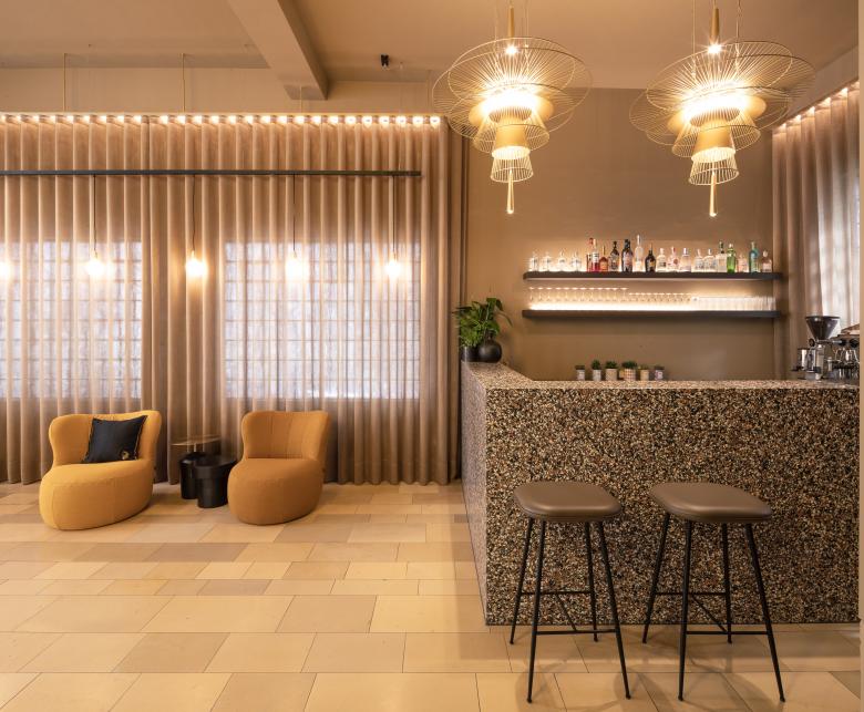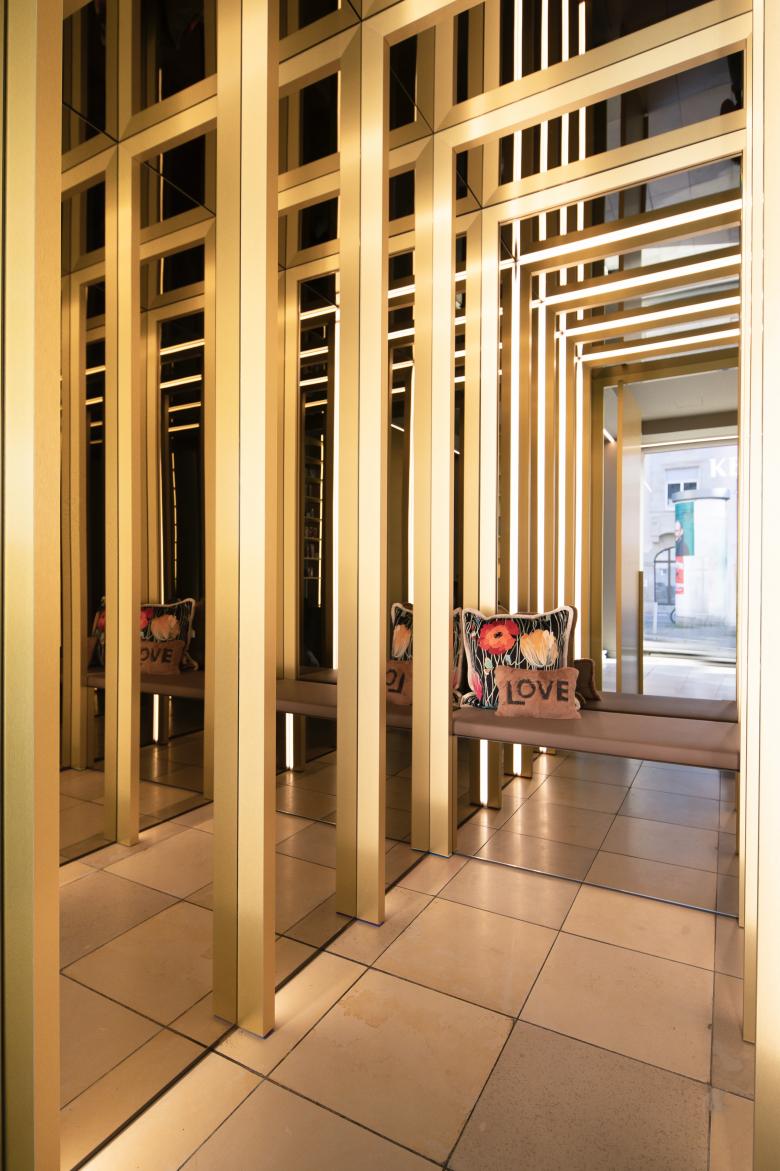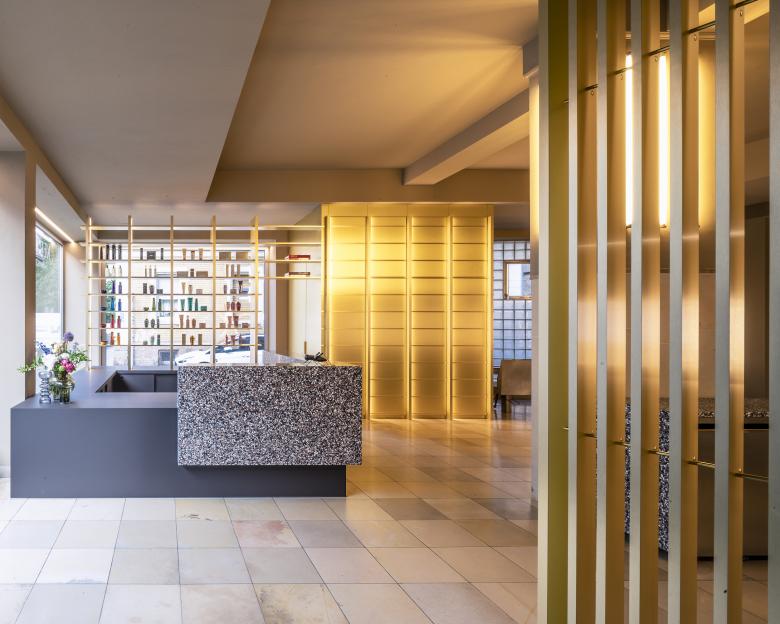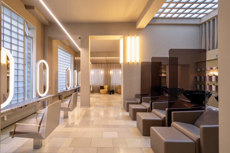 Charakteristisch für die von Cyrus Ghanai neu gestalteten Räume: große Fensterflächen, hohe Räume, ein Boden aus Solnhofer Naturstein und eine feste Möblierung in Form von Friseurstühlen, die der Designer Heinz Legler entworfen hatte. Ghanai öffnete den Eingangsbereich und schuf Platz für eine Theke und ein Verkaufsregal, das nahtlos in einen Schrank übergeht. Hauptthemen des Konzeptes: die Linienführung und das Material der Friseurstühle. Diese adaptierte Cyrus Ghanai auf das Design der Lichtbänder und der Wandbeleuchtung. Passend zur Farbgebung des Bodens ersetzte er die Glasablagen an den Arbeitsplätzen durch Terrazzo, der auch für die Empfangstheke und die Verkleidung der Bar verwendet wurde. Überdies entwarf Ghanai runde und ovale, beleuchtete Spiegel und strukturierte die Waschplätze neu. Für den hinteren Bereich entwarf er eine Bar mit Lounge. Highlight im Konzept: ein Schrank aus Echt-Messing-Laminat. Das verspiegelte und beleuchtete Möbel dient als Ankleide und „Social Media-Fotokabine“. Somit können Pflügers Kunden die neuen Looks direkt auf Social Media präsentieren.