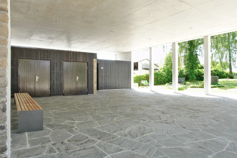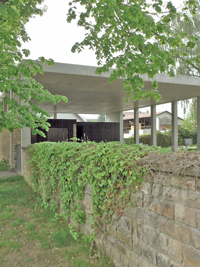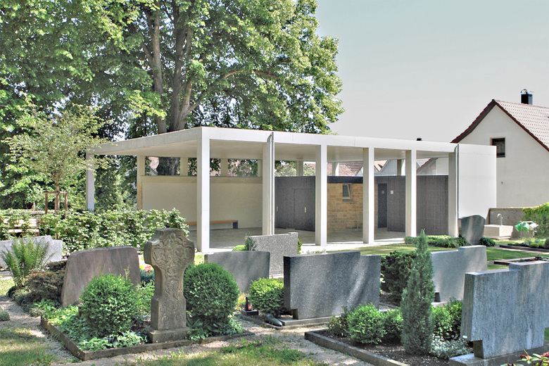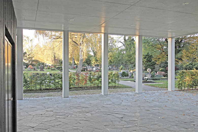 Mittels eines frei gespannten Stahlbetondachs konnte mit geringem Budget das 1966 erbaute Börtlinger Leichenhaus großzügig erweitert werden. Die Natursteinmauer und die vorhandenen Nebenräume wurden in den Neubau integriert und um weitere Räumlichkeiten ergänzt. Der Sichtbeton der Überdachung, die dunkel lasierten Holzlamellen vor den Nebenräumen und der Bodenbelag aus Naturstein im Polygonalverband prägen die feierliche Atmosphäre der Aussegnungshalle.