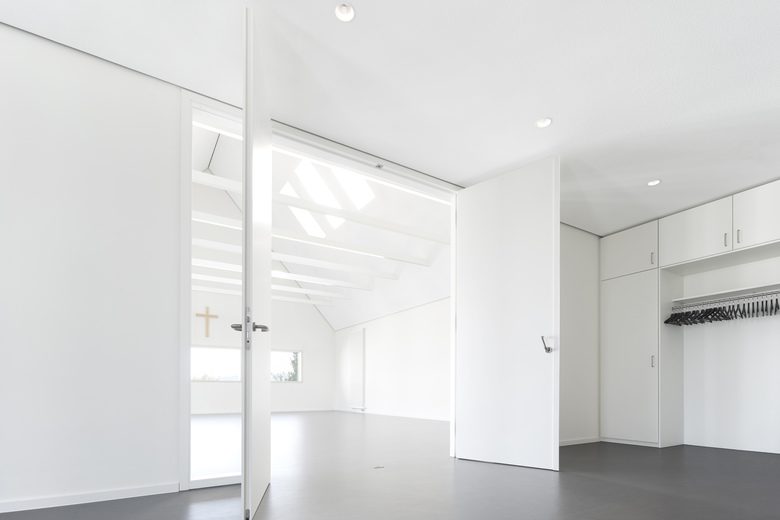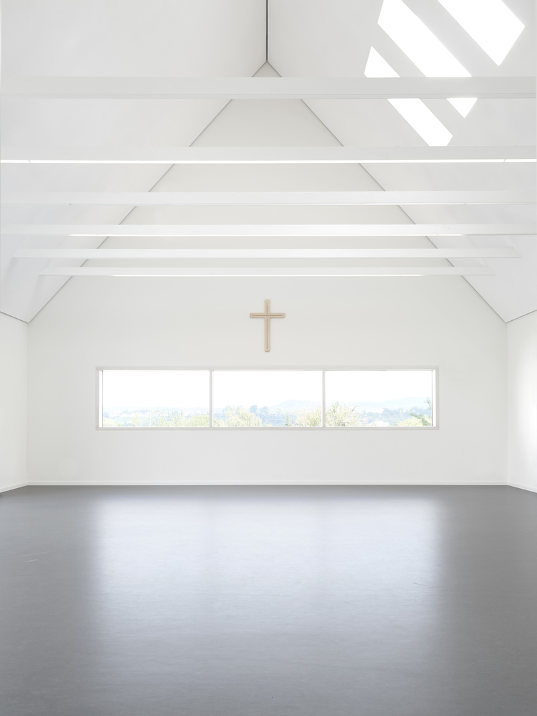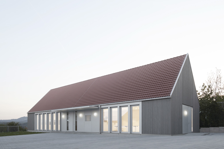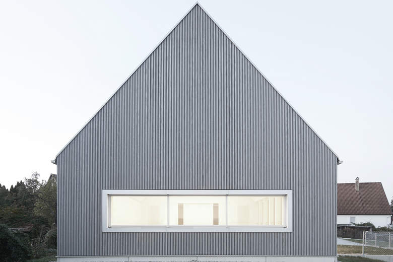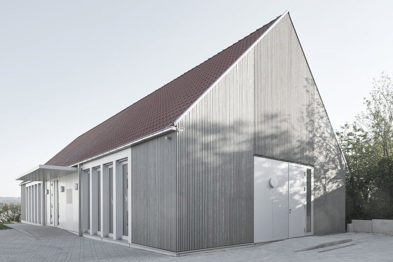 Der langgestreckte Baukörper des neuen Evangelischen Gemeindehauses in Göppingen Holzheim befindet sich hinter der spätmittelalterlichen St. Bernhardkirche. Die Baumasse ist direkt an der östlichen Grundstücksgrenze in Verlängerung der Sakristei platziert um sowohl für Veranstaltungen wie auch für die notwendigen Parkplätze ausreichend Raum anzubieten. Außerdem lenkt diese Gebäudekonstellation auch den Blick auf den nahe liegenden geschichtsträchtigen Berg Hohenstaufen. Die Gebäudetypologie mit eingeschossiger Nutzung und steilem Satteldach lehnt sich an ortstypische landwirtschaftliche Nutzbauten an. Das Gebäude ist, abgesehen von der Bodenplatte, eine reine Holzkonstruktion, die konsequenterweise auch mit einer grau lasierten Holzlattung verkleidet ist. Die Fenster der Aufenthaltsräume sowie der Eingang werden durch silberfarben eloxiertes Aluminium hervorgehoben. Das großzügige Volumen des Gemeindesaals spiegelt die Gebäudeform wider und ist geprägt durch die Zugstäbe der Dachkonstruktion. Darin ist gleichzeitig auch die Beleuchtung in Form von unauffälligen LED- Lichtbändern integriert.