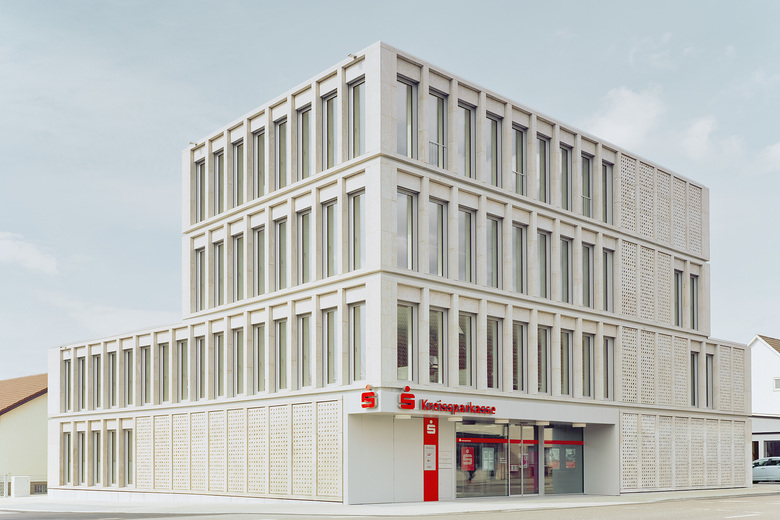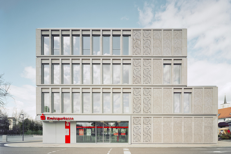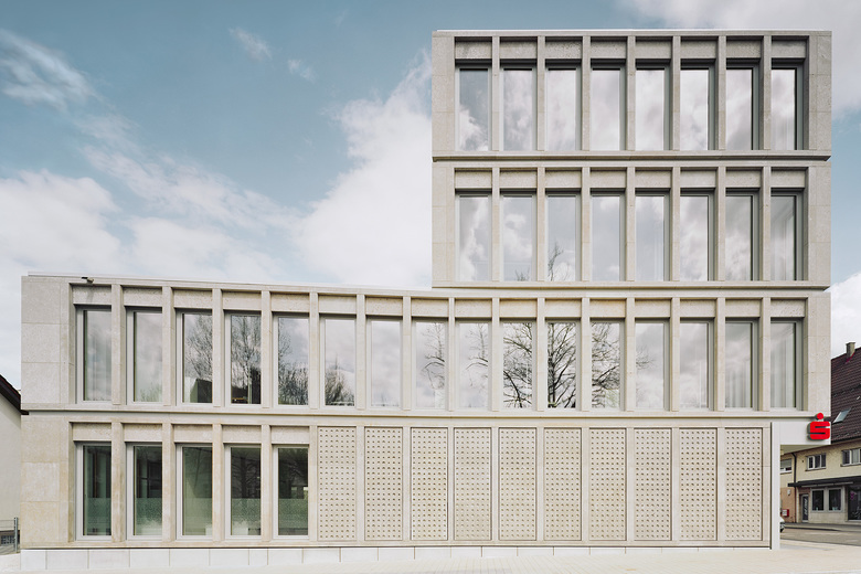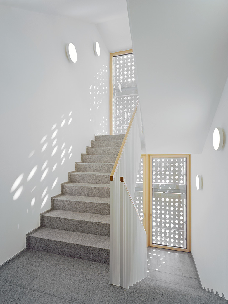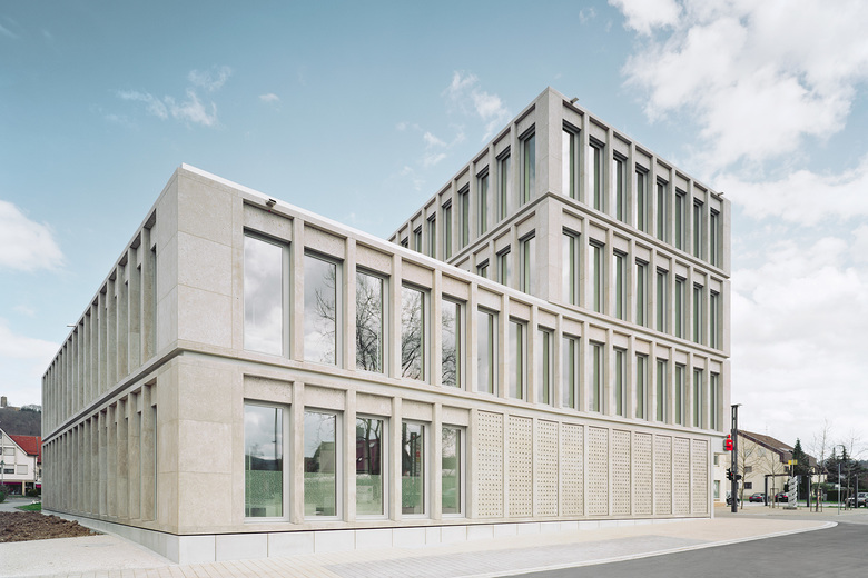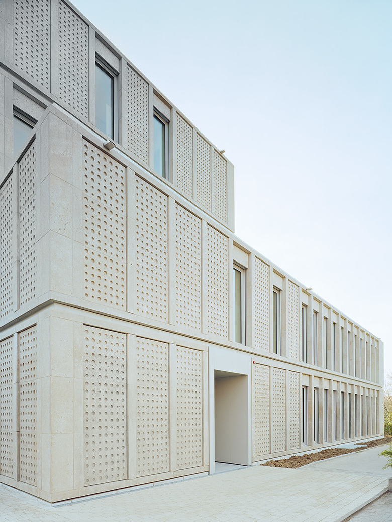 Die markante Fassade aus Muschelkalk spiegelt die Nutzung sowie auch die Gebäudestruktur wider: Die Anordnung der Gesimse, Lisenen und geschlossenen Flächen verweist sowohl auf das dahinterliegende Tragwerk wie auch auf die Lage der Nebenräume. Diese verbergen sich hinter den perforierten Natursteinelementen. Im Bereich des Treppenraums ist die Perforation auf die gesamte Steintiefe ausgeführt was bei Sonnenschein im Innenraum zu ausdrucksvollen Lichteffekten führt.