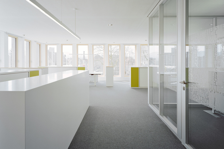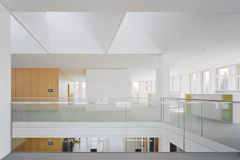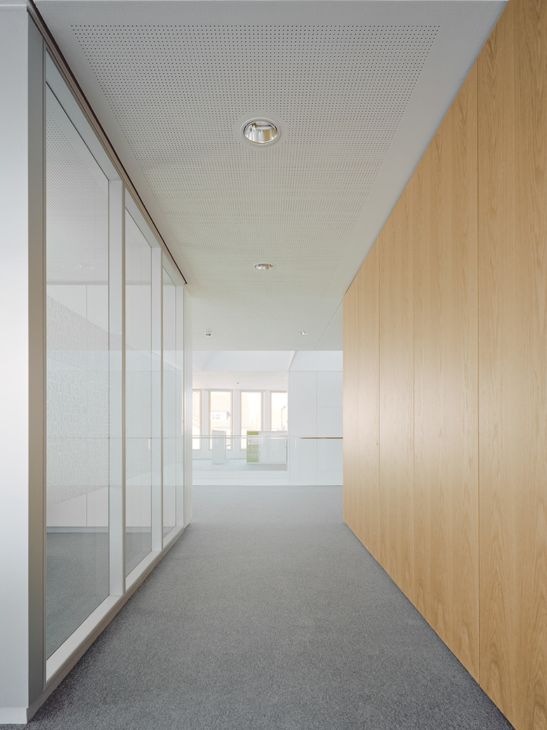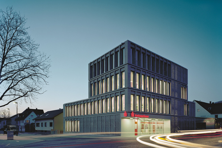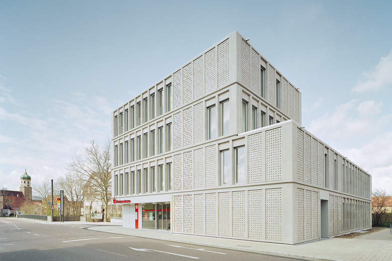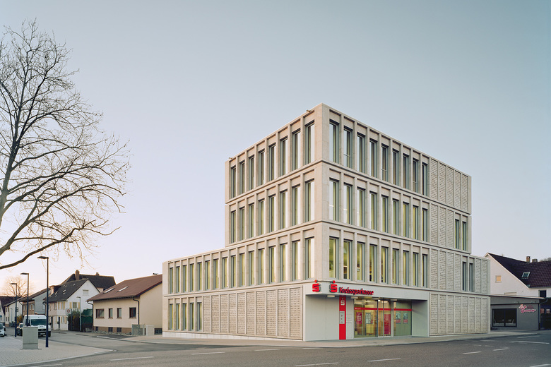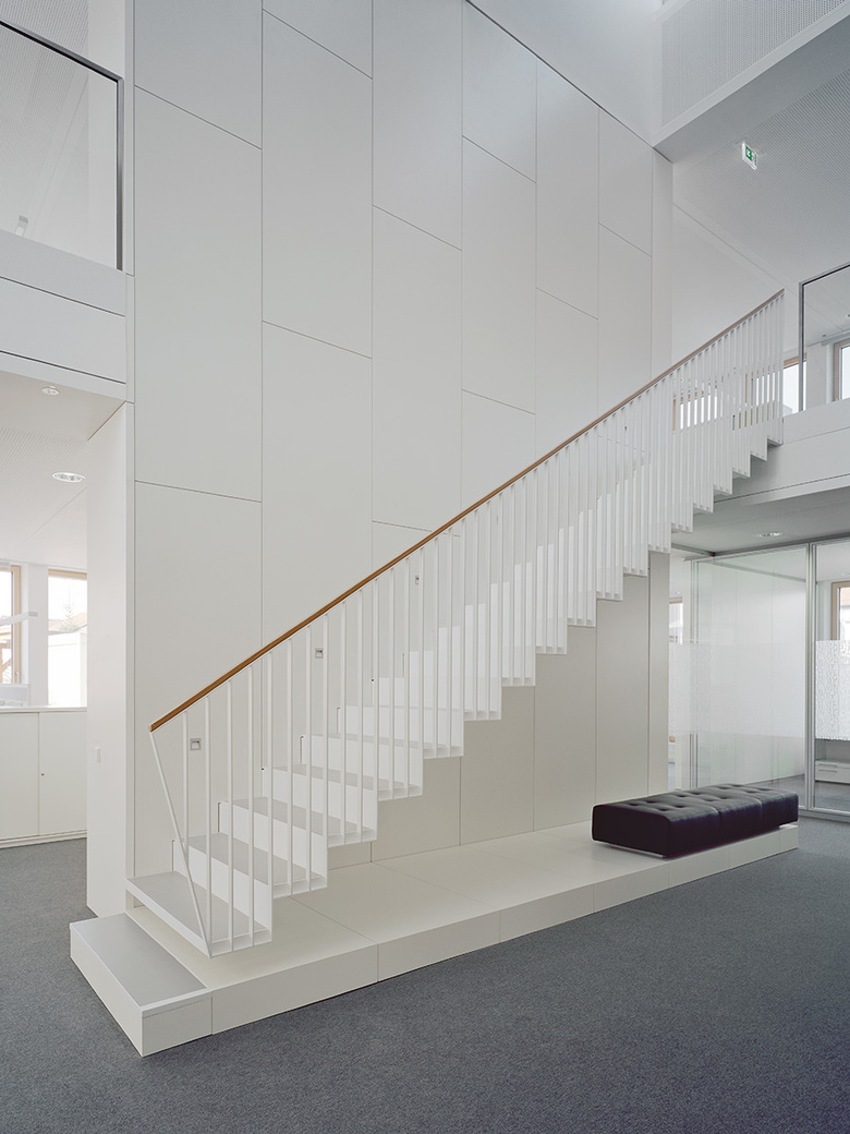 Die markante Fassade aus Muschelkalk spiegelt die Nutzung sowie auch die Gebäudestruktur wider: Die Anordnung der Gesimse, Lisenen und geschlossenen Flächen verweist sowohl auf das dahinterliegende Tragwerk wie auch auf die Lage der Nebenräume. Diese verbergen sich hinter den perforierten Natursteinelementen. Im Bereich des Treppenraums ist die Perforation auf die gesamte Steintiefe ausgeführt was bei Sonnenschein im Innenraum zu ausdrucksvollen Lichteffekten führt.