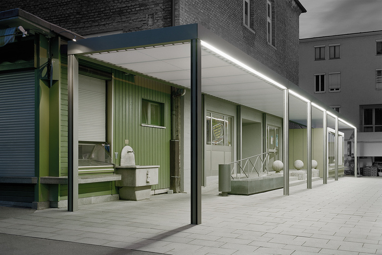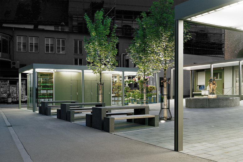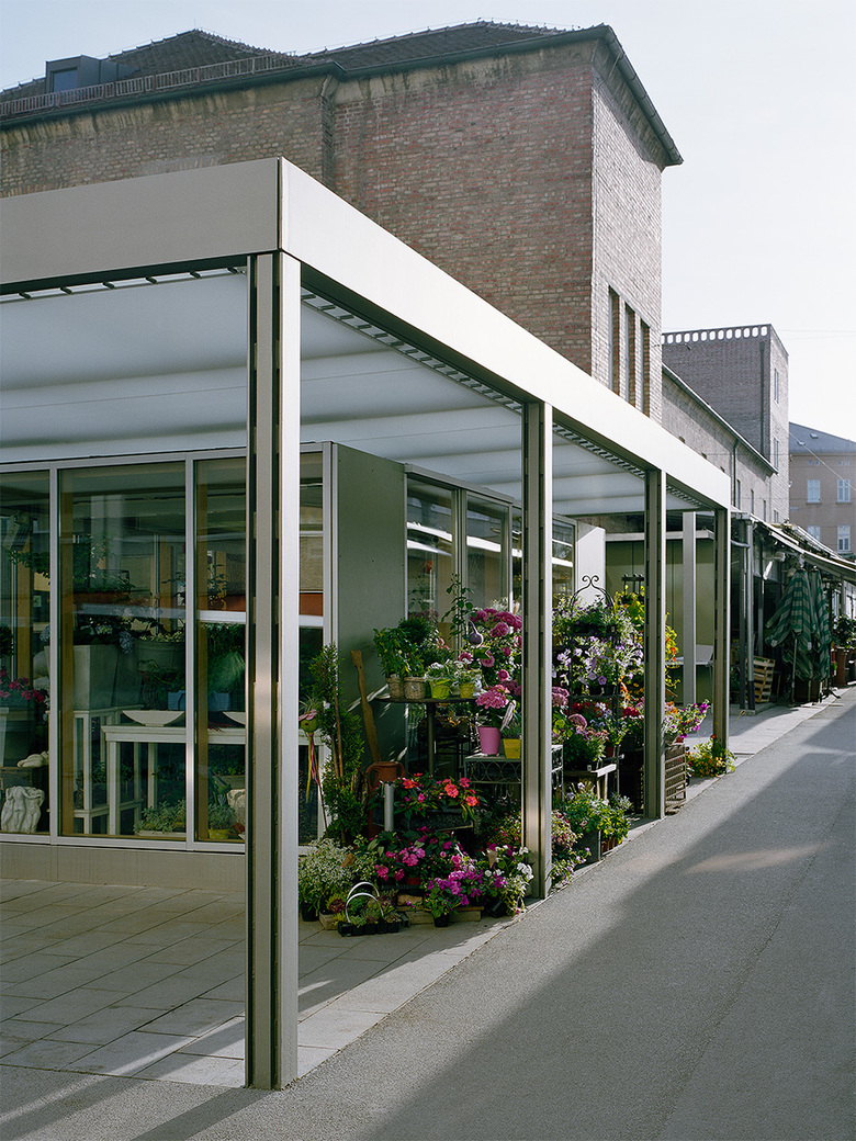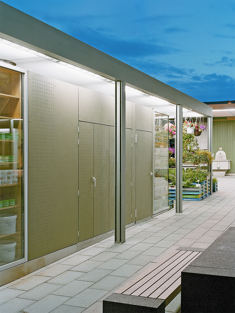 Eine Fläche aus hellen Granitplatten, bebaut mit drei neuen Marktständen sowie dem Fleischhallenvordach, bildet den neuen Marktbrunnenplatz auf dem Augsburger Stadtmarkt. Einen Kontrapunkt zu den komplexen technisch- und nutzungsbedingten Vorgaben setzt die ruhige Architektursprache der raumbildenden Stahl- Glasüberdachungen, deren transluzente Spanndecke tagsüber und in den Abendstunden den Verkaufsflächen angenehmes Licht spendet. Die darunter angeordneten faserzementverkleideten Massivholzboxen spiegeln im Erscheinungsbild ihre jeweilig individuelle Nutzung wider.