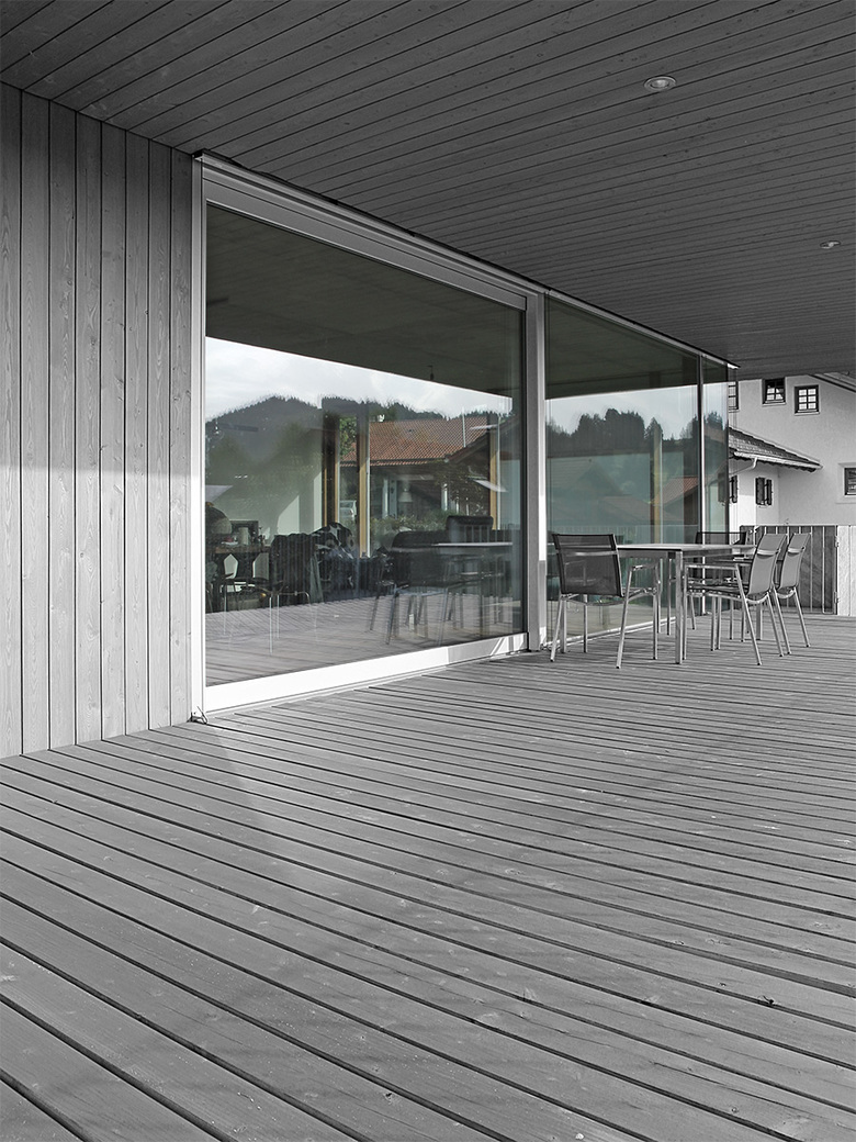 Trotz Einhaltung wesentlicher Gesichtspunkte des rigiden Bebauungsplans verkörpert das Einfamilienhaus inklusive kleiner Büroeinheit im Gegensatz zur ortsüblichen Bebauung eine eigenständige Architektursprache. Signifikante Dachüberstände nach Ost und West verleihen dem Gebäude ein plastisches Erscheinungsbild. Dieser Eindruck wird durch die homogene Verkleidung mit einer vertikalen Holzverschalung gestärkt. Um möglichst viel Grünfläche zu erhalten, wurde die Doppelgarage in die Hauskubatur integriert. Das umfangreiche Raumprogramm verteilt sich über drei Geschosse. Im Inneren ist das weitläufige Wohn- und Esszimmer der Dreh- und Angelpunkt des Hauses. Eine großzügige Über-Eck-Verglasung öffnet den Blick auf das nahe liegende Bergpanorama der bayrischen Alpen.