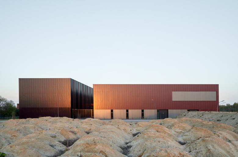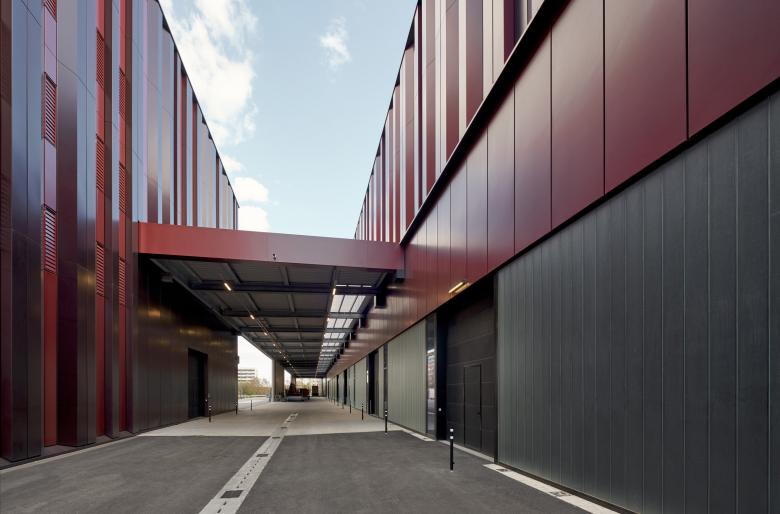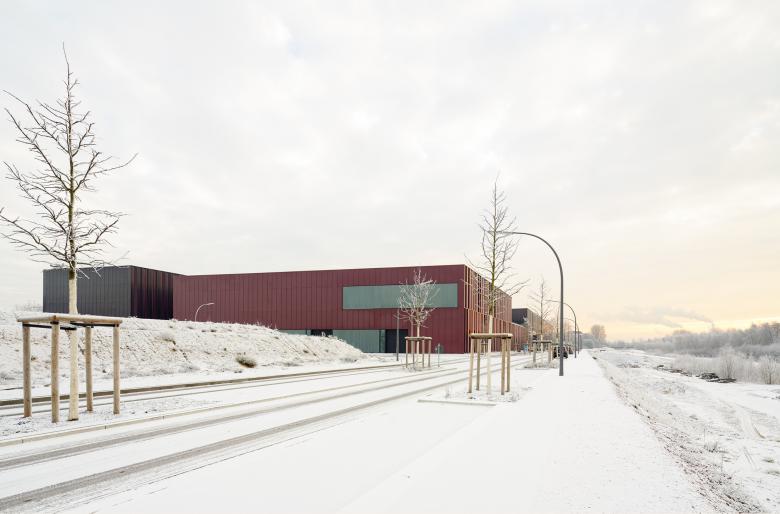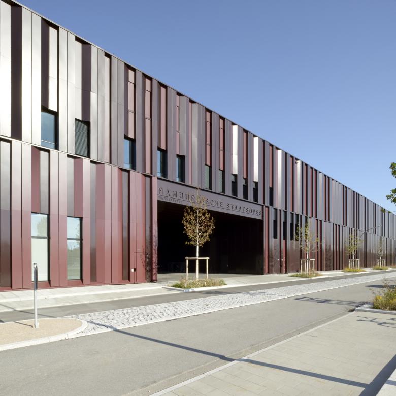 Durch den Neubau werden die bisher auf drei Standorte verteilten Fundi und Werkstätten der Hamburger Staatsoper auf dem Gelände des Neuen Huckepackbahnhofes im Hamburger Stadtteil Rothenburgsort zusammengeführt. Auf einer Fläche von ungefähr 22.000 Quadratmetern werden hier Kulissen, Requisiten und Kostüme produziert und gelagert. Die Wettbewerbsaufgabe sah vor, das vorhandene funktionale Konzept für die Zusammenlegung der verschiedenen Bereiche im städtebaulichen Kontext des Huckepackbahnhofes zu optimieren und umzusetzen. Der Entwurf reagiert darauf mit einer klaren, selbstbewussten Architektursprache, die durch eine reduzierte Wahl von Farbe, Form und Struktur geprägt ist. Die Herausarbeitung spezifischer und prägender Entwurfselemente erzeugt Plastizität und Schattenwurf. Der Entwicklung der Fassade liegt ein Gestaltungsprinzip zugrunde, das sowohl aus der Ferne als auch aus der Nähe eine ansprechende Wirkung auf den Passanten und Bahnreisenden erzeugt. Als Fassadenmaterial wird in Metalloptik beschichtetes Aluminiumblech gewählt. Die differenziert gekantete Metallfassade stellt als abstrakte Interpretation eines Bühnenvorhanges Bezüge zur Staatsoper her. Durch das Gestaltungsprinzip der Inversion zweier Farbtöne rotbraun und bronze werden die unterschiedlichen Hauptfunktionsbereiche differenziert. Diese Differenzierung in Farbe und Struktur verleiht den Nutzungsbereichen ihre eigene hochbauliche Identität, gleichzeitig wird durch das gestalterische Grundkonzept eine städtebaulich homogene Einheit mit einer gemeinsamen Adresse geschaffen. Das Erscheinungsbild der plastisch ausgebildeten Metallpaneele verändert sich im Laufe des Tages durch den unterschiedlichen Schattenwurf der geneigten Flächen. Die kompakte und dichte Bauweise ermöglicht eine optimale Flächennutzung. Verfeinerungen in Proportion und Gestalt verleihen dem Ensemble die gewünschte gestalterische Kraft und einen hohen Wiedererkennungswert.