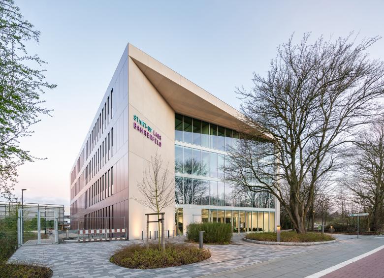 Im Nordosten des Forschungscampus in Hamburg-Bahrenfeld, am Übergang zwischen Luruper Hauptstraße und Luruper Chaussee, entsteht das Innovationszentrum „Start-up Labs Bahrenfeld“. Mit dem Innovationszentrum wird ein Gemeinschaftsprojekt von DESY, der Universität Hamburg und der Freien Hansestadt Hamburg realisiert, das Gründern und jungen Unternehmen aus wissenschaftlichen Forschungsfeldern anmietbare Flächen mit der nötigen Infrastruktur zur Verfügung stellt, um beste Voraussetzungen für den Wissenstransfer sowie die Herstellung neuer innovativer Produkte zu schaffen. Der viergeschossige Baukörper beherbergt kleinteilig vermietbare Büroflächen in einer kommunikativen Raumstruktur sowie komplexe Labor- und Werkstattbereiche. Der helle Eingangsbereich mit seinem Glasdach erstreckt sich über alle Ebenen und bildet mit seiner prägnanten schwarzen Wendeltreppe und der Lichtinstallation das Zentrum des Baukörpers. Die offene, an den Eingangsbereich anschließende Cafeteria integriert, ebenso wie weitere halböffentliche Bereiche, ein taktiles Leitsystem, das die Ansprüche von Blinden und seheingeschränkten Menschen berücksichtigt. Als Fassadenmaterial wird in Metalloptik beschichtetes Aluminiumblech gewählt, das je nach Tageszeit und Sonnenstand sein Erscheinungsbild ändert. Die großzügige Glasfassade im Nordosten wird durch weiße Betonsteine gerahmt. Durch den prägnanten Versatz entsteht ein überbauter, kommunikativer Raum, der sich zur Luruper Chaussee öffnet und ein weithin sichtbares Zeichen am Kreuzungspunkt mit der Stadionstraße setzt.