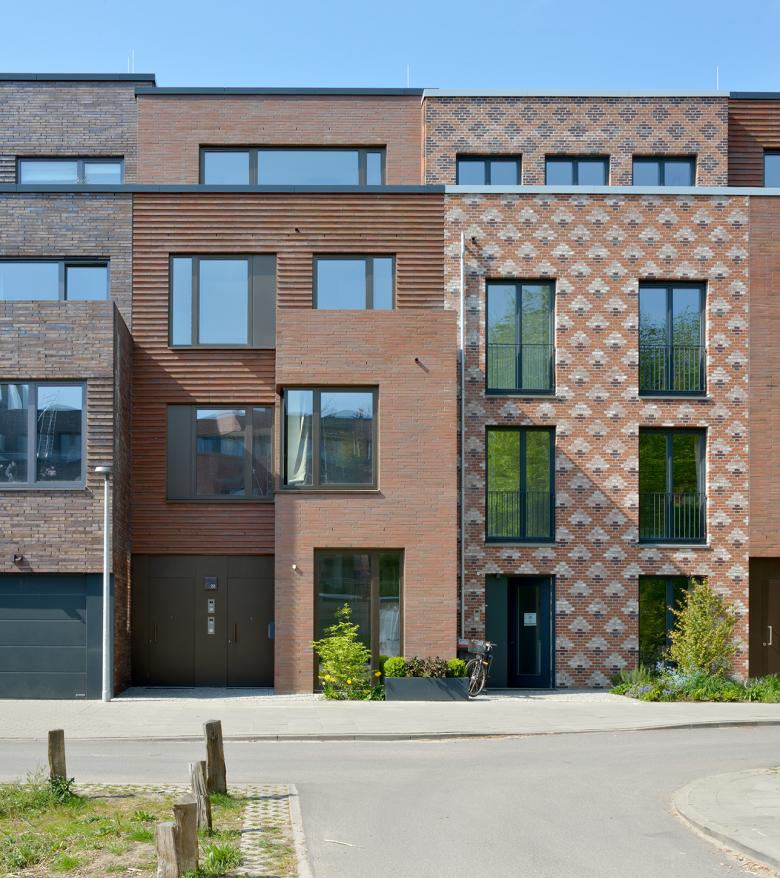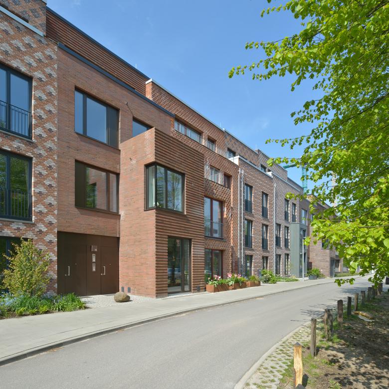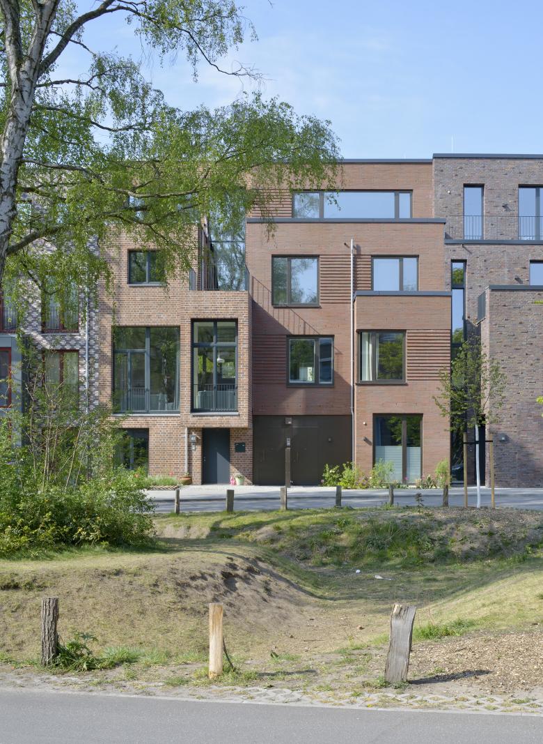 In Hamburg-Uhlenhorst entstehen im Rahmen eines Baugemeinschaftsprojektes 24 Stadthäuser zwischen Grünzug und Stadtgeschehen. Nach den Entwürfen der Hamburger Büros Kraus Schönberg Architekten, APB und DFZ Architekten sowie dem Londoner Büro Adam Khan Architects werden elf Stadthäuser als Einfamilienhäuser und dreizehn Stadthäuser mit jeweils zwei übereinander liegenden Maisonettewohnungen realisiert. Entwickelt wurden hierfür in enger Kooperation mit der Bauherrschaft zwölf verschiedene Haustypen, die in bunter Folge durchmischt werden. Alle Häuser verfügen über drei Vollgeschosse und ein Staffelgeschoss, die durch die unterschiedlich verwendeten Fassadenklinker ein differenziertes Erscheinungsbild erzeugen. So lässt DFZ Architekten für zwei seiner insgesamt sieben gestalteten Stadthäuser in einer Sonderausführung einen Doppelklinkerstein herstellen, der in der Mitte gebrochen und mit Bruchkante nach außen vermauert wird. Neben dem differenzierten Erscheinungsbild erhalten alle Stadthäuser individuelle, an die Bedürfnisse der Bewohner angepasste Grundrisse. Von den sieben von DFZ realisierten Stadthäusern werden drei als Einfamilienhaus konzipiert, die das Wohnen über vier Ebenen ermöglichen und fünf Zimmer, eine Wohnküche, Dachterrasse sowie die angelegte Terrasse mit Garten umfassen. Vier der Stadthäuser beherbergen jeweils zwei Maisonettewohnungen, die über einen privaten Eingang sowie Dachterrassen beziehungsweise einen Garten verfügen. Bei allen sieben als Effizienzhaus-Plus (Blockheizkraftwerk und Photovoltaikanlage) konzipierten Stadthäusern wird der Erker als Thema des Hamburger Stadthauses aufgenommen und ein- beziehungsweise zweigeschossig ausgebildet. Große, zum größten Teil bodentiefe Metallfenster sorgen in allen Räumen für eine optimale Belichtung.