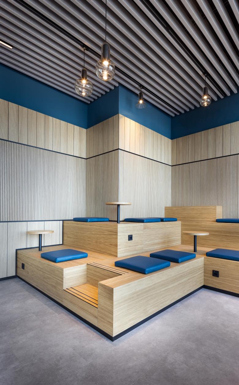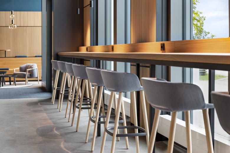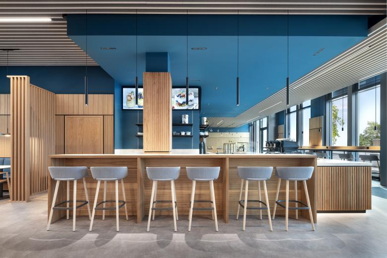 Measuring around 250 square metres, the bistro is a publicly accessible hybrid social space that combines function and atmosphere, companionship and quiet relaxation – a prime example of a new work culture that puts people and their needs centre stage. The project was designed not as a closed office space but rather as an integrative part of a larger urban framework and reflects how the working world is shifting more towards a greater sense of purpose, flexibility and community.