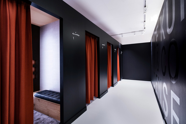 Wer bei Eintritt geradeaus läuft, gelangt direkt zum sieben Meter langen Ausgabetresen online bestellter Artikel. Das etablierte Click & Collect System findet hier seine gehobene Ausführung. Die Umkleidekabinen im edlen CI-Schwarz mit rubinroten Vorhängen und Lederbänken gleichen einer Suite. In übergroßer Ausführung bieten sie ausreichend Platz für die Anprobe in atmosphärischer Lichtstimmung. Zeitgleich wird das Smartphone bedarfsweise an einer USB-Schnittstelle aufgeladen. Neben persönlicher Beratung vor Ort steht ein sogenannter Social Mirror zur Verfügung. Vor diesem Flachbildschirm können Digital Natives Film- und Bildmaterial erstellen und direkt auf sozialen Netzwerken teilen oder per Mail verschicken.