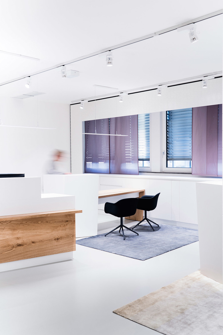 Auf Höhe des Click & Collect Tresens repräsentiert ein verglastes Büro die offene Haltung der Abteilungsleitung des Kundenservices. Von hier geht es in die räumlich abgetrennten Bereiche der persönlichen Beratung. Die individuell entwickelten Möbel mit unterschiedlichen Arbeitshöhen sind ergonomisch sinnvoll und funktional. Lose Teppiche mit Farbverlauf und Glanzgrad sorgen auch hier für eine kundenfreundliche Raumstimmung.