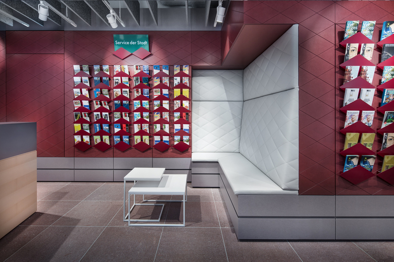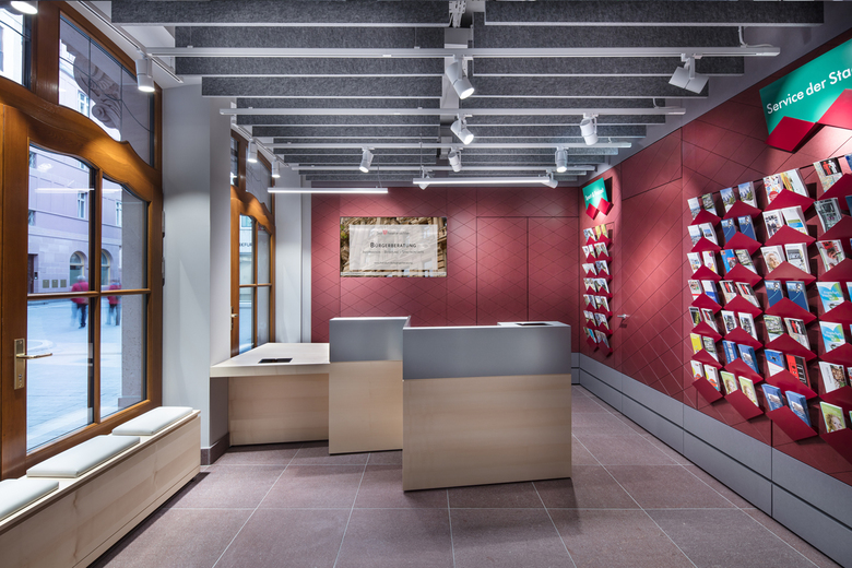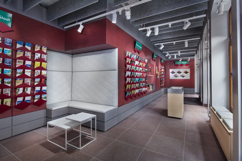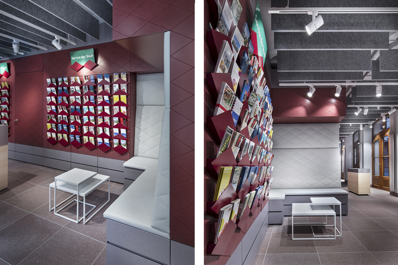 Für den persönlichen Kontakt mit den Kennern der Stadt steht ein barrierfreier Counter in einer Kombination aus hellem Holz und reflektierendem Edelstahl zur Verfügung. Zudem fügt sich eine gemütliche Sitznische in die Wandkonstruktion ein und unterstreicht die gastfreundliche Atmosphäre. Die Höhe des schmalen Raumes wird durch die offene Decke erhalten. Hier bilden Akustik-Baffeln und Leuchtschienen eine symbiotische Reihung und verleihen dem Raum eine angenehme Akustik und optimale Beleuchtungsoptionen. Diese Kombination aus modernem Design, Innovationskraft und hoher Servicequalität macht die Bürgerberatung Frankfurt zum Pionier und verleiht ihr deutschlandweit einen einzigartigen Charakter.
