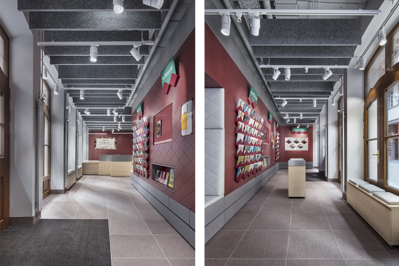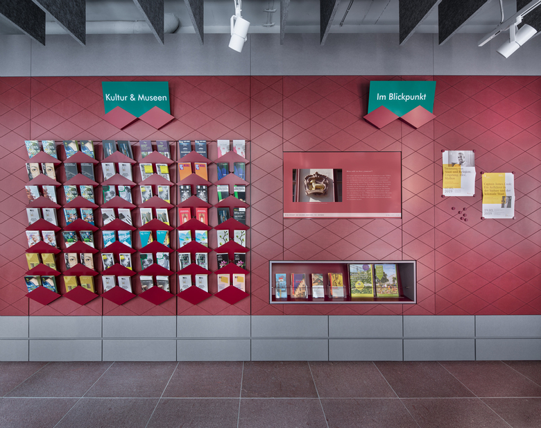 Die Designsprache nimmt Bezug zu den traditionellen Farb- und Materialwelten der direkten Umgebung und kontrastiert sie mit kühlen Materialien. Gefasst wird die Fläche von einem umlaufenden Band im warmen Rotton, das die Aufmerksamkeit vorbeilaufender Passanten auf sich zieht. Der hochwertige Natursteinboden greift den Farbton auf und ist zugleich angelehnt an die originalgetreuen Sandstein-Töne des Viertels. Raumprägend ist zudem die Rautenstruktur des oben genannten Bandes, die durch aufgesetzte Prospekttaschen eine dreidimensionale Wirkung entfaltet. Als Inspirationsquelle diente hierfür das traditionelle Frankfurter Apfelweinglas, das „Gerippte“. Übersichtlich kategorisiert finden Besucher hier ständig aktualisierte Prospekte und Flyer wieder.