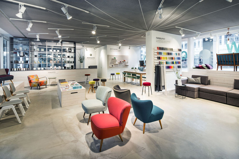 Ein großes Regal bildet als raumtrennendes Element Sichtschutz für den dahinterliegenden Bürobereich und das Lager, um eine gute Arbeitsatmosphäre zu schaffen. Durch die Offenheit des Regals wird die Arbeit der Designer dennoch transparent in den Laden integriert.