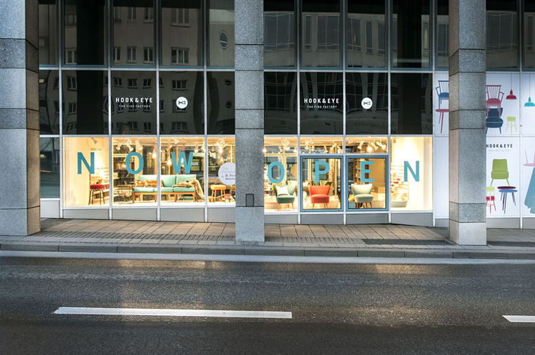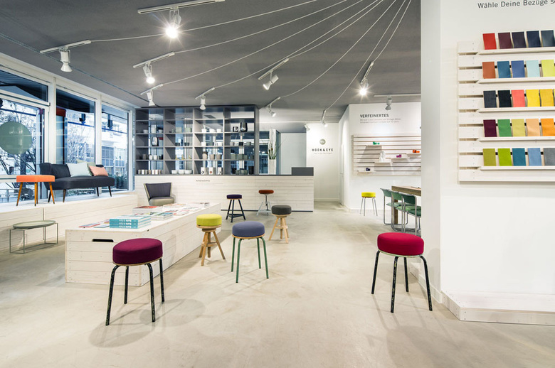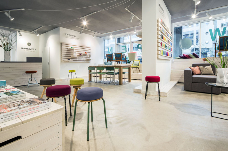 Für das Stuttgarter Label HOOK&EYE – The Fine Factory entwickelt DIA – Dittel Architekten eine Markenstrategie mit preisgekrönter Geschäftsausstattung sowie den ersten Showroom mit Bürobereich im Atelier-Charakter. Das Startup verkauft eigene Möbelstücke, restaurierte Vintagemöbel und Accessoires sowie Designprodukte auf 160 m². Das Raumkonzept ist hell und zurückhaltend, um die farbenfrohen Möbel wirken zu lassen. Den Kern des Material- und Farbkonzeptes bildet weiß lackiertes Nadelholz und verschiedene Grauabstufungen.