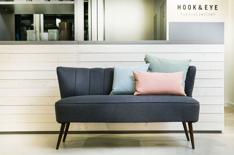 Kurzer Text: Neben eigenen Möbeln und restaurierten Vintage-Stücken entwirft HOOK&EYE Accessoires wie Kissen und Taschen. Das Raumkonzept des Showrooms ist auf die Zurschaustellung ausgelegt.