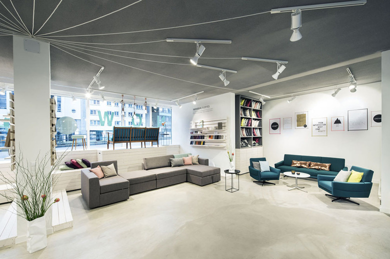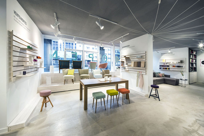 Das Beleuchtungskonzept beinhaltet eine verspielte Anordnung von weißen Textilkabeln an der grau gestrichenen Decke, bleibt aber gleichzeitig schlicht und funktional und spiegelt so den Charakter der Marke wieder.