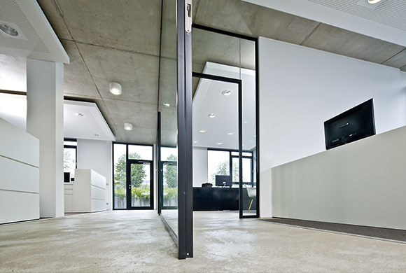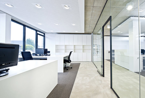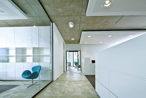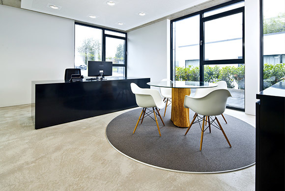 Die hochwertige Möblierung in den Büros setzt sich aus einer Mischung aus selbst entworfenen funktionalen Möbeln und Design-Sitzelementen zusammen. Die Maßanfertigungen sind zum Großteil in weißem Schichtstoff ausgeführt. Das kühle Weiß der Möbeloberflächen wird in vielen Bereichen kontrastiert. Die schwarz lackierten Glaszargen, sowohl an der Fassade als im Innenbereich, stellen den Bezug zur Außenansicht des Gebäudes her und werten den Innenraum als gestaltendes Element auf. Wie die Empfangstheke steht das Büro des Geschäftsführers im Kontrast zur übrigen Büromöblierung und besticht in schwarzem Corian.