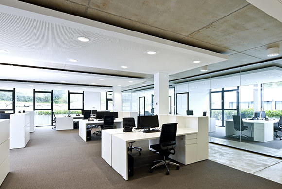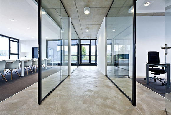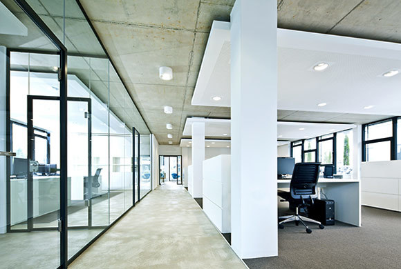 Ein wichtiger Faktor im Innenbereich des Gebäudes ist die Zonierung durch das Interior Design. Im Bereich der Büros begrenzt Teppich die einzelnen Arbeitsinseln, an der Decke spiegelt sich die Zonierung durch analoge Deckensegel wieder. Laufwege sind dagegen in Sichtestrich ausgeführt. Das Design definiert die Bereiche.