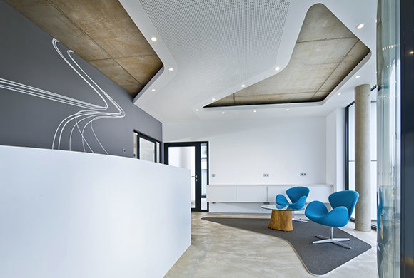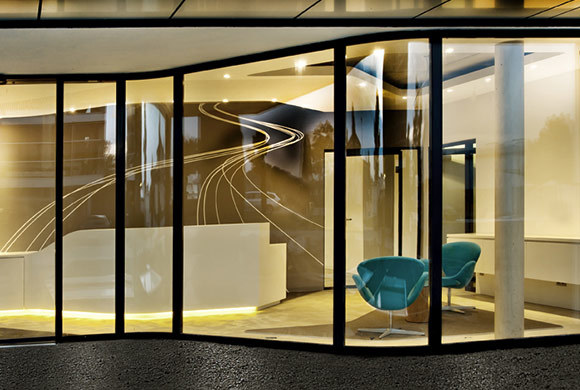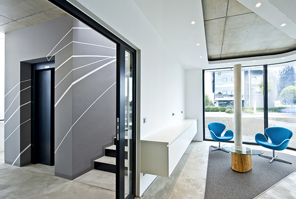 Die Wände im Empfangsbereich und die Verkleidung des Aufzugs wurden außerdem mit Wandgrafiken bespielt, die von den Kommunikationsdesignern von DIA – Dittel Architekten in Anlehnung an das Corporate Design des Unternehmens in dynamisch geschwungenen Linien ausgeführt worden sind.