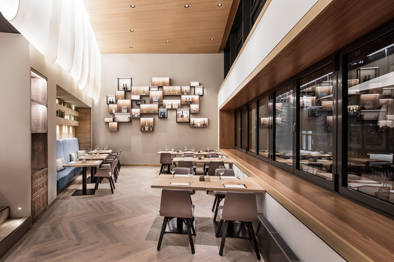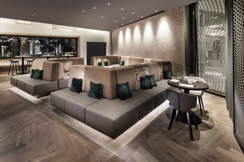 An zentraler Position und mit auffälliger Form- und Lichtinszenierung wird die Bar zum Anziehungspunkt bei Betreten des Restaurants. Mit vierseitiger Öffnung verbindet sie alle Bereiche miteinander und schafft Blickbezüge. Der edle Juraschiefer-Korpus steht im Einklang mit einer Steinfliesentheke, die über eine Messing-Lisene in den dunklen Eichenholz-Abschluss übergeht.