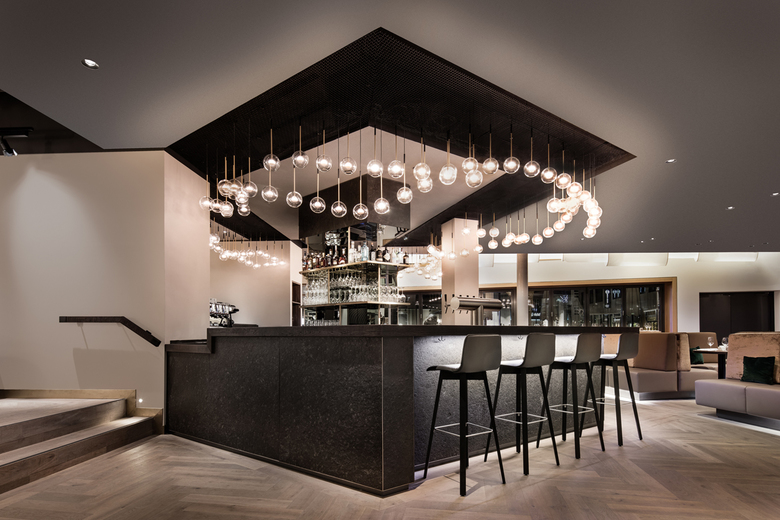 Die wellenförmige Aufhängung der individuell angefertigten Designleuchten kontrastiert mit der Kantenbetonung des selbstbewussten Barkörpers.