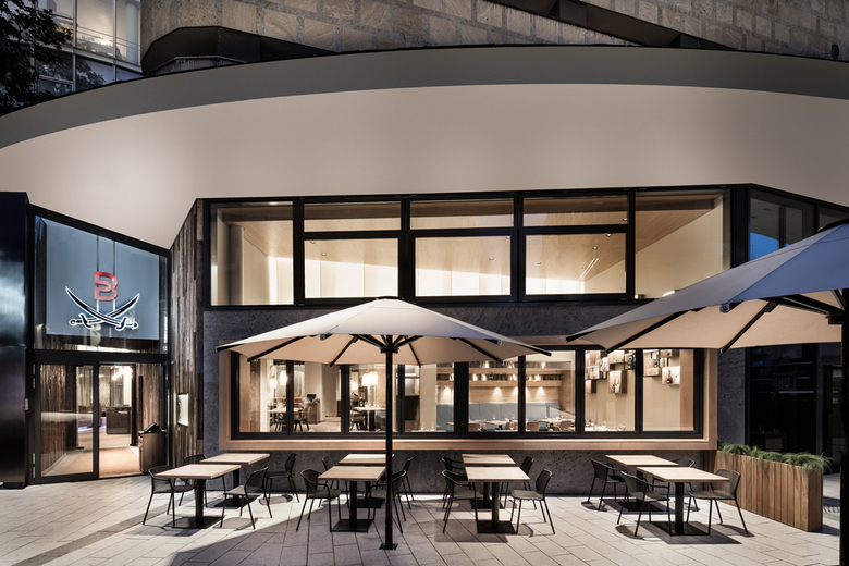 Als bauliche Erweiterung des Modehauses mit zwei gegenüberliegenden Eingangsportalen verbindet die Sansibar by Breuninger zur Ladenöffnung die Karlspassage mit dem Dorotheenplatz. Mit 377 Sitzplätzen im Innen- und Außenbereich auf 765 Quadratmetern ist das Restaurant auch nach Ladenschluss das Flaggschiff des neuen Viertels.