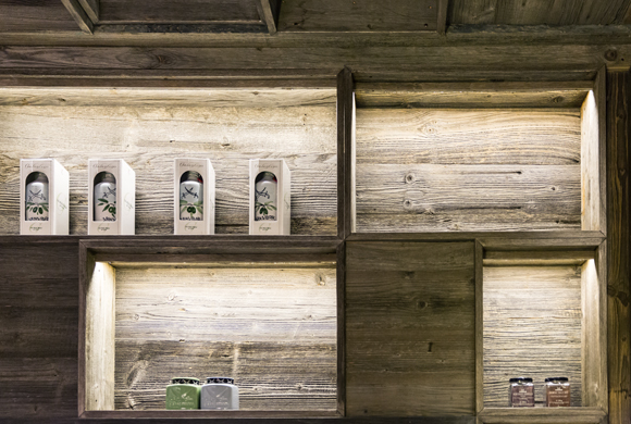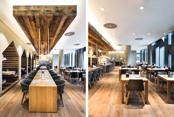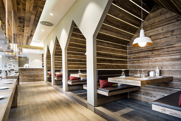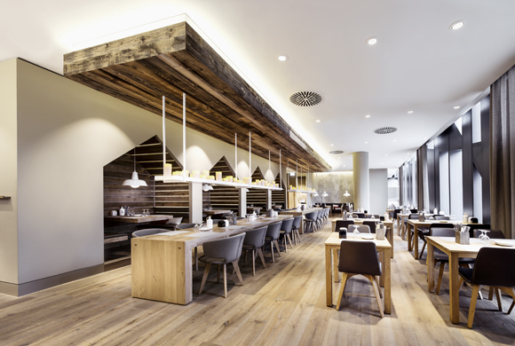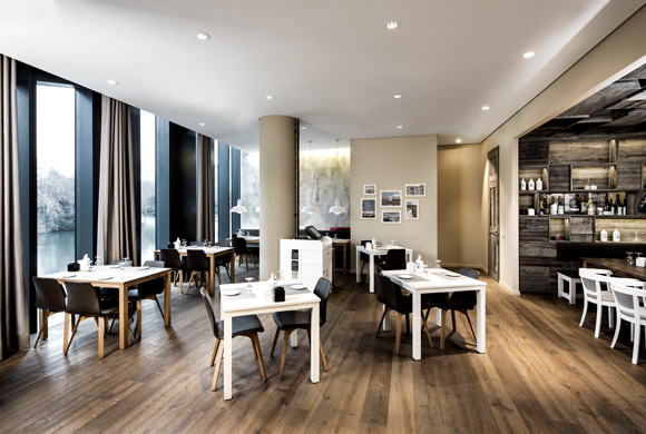 Verschiede Zonen bieten Platz für ca. 130 Gäste. Das zentrale Element im Raum ist die große Bar, die sich tagsüber auch zum Verkaufsraum von Breuninger offen zeigt und Gäste einlädt, sich bei einem Snack auszuruhen. Neben flexibler Möblierung im Fassadenbereich mit schönem Ausblick auf den See, umfassen die an den Stirnseiten liegenden Bankettsitze den Raum. Unterstützt werden sie durch eine patinierte Wandgestaltung in Anlehnung an einen alten Weinkeller. Zwei große massive Mittelraumtische fördern Kommunikation und Ungezwungenheit, die abgehängten Kerzenleuchten spenden angenehmes Licht.