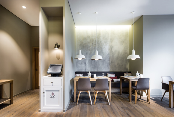 Der Bodenbelag besteht aus ungewöhnlichem Parkett mit gewollt rustikaler grober Oberfläche in einem leichten Schieferton. Die Gestaltung der Wände wurde in dazu passenden Sandtönen ausgeführt; weißer Mineralwerkstoff für die Thekenoberfläche rundet die freundliche Atmosphäre ab. Für kleine Farbakzente sorgen die gestreiften Stoffe der Kissen, die für den Gast die Assoziation mit Sylt komplettieren.
