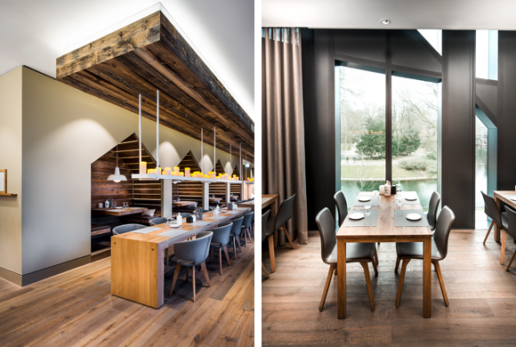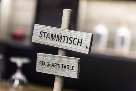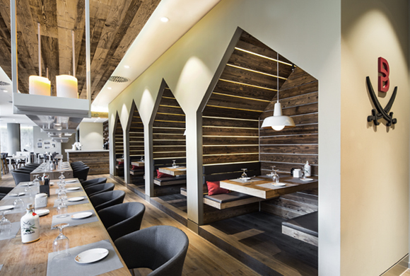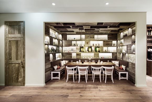 Für größere Gruppen bietet die Stammtisch-Ecke eine gemütliche Rückzugsmöglichkeit. Hier steht der Wein im Vordergrund. Wand und Decke bilden sich aus einer Verkleidung, die die Optik von gestapelten Weinkisten hat. Ein darin integriertes Fenster bietet Einblick in den üppig bestückten Weinklimaraum. Über dem massiven patinierten Tisch sorgen Leuchten aus Weinflaschen für stimmungsvolle Beleuchtung. Eine zweite raffinierte Besonderheit neben dem Stammtisch stellen die vier indirekt beleuchteten Separeés dar, die erneut eine klare Verbindung zur Sylter Sansibar herstellen. Sie muten einfachen Holzhütten an, sind aber Formensprache und Beleuchtung betreffend schlicht und modern ausgeführt.