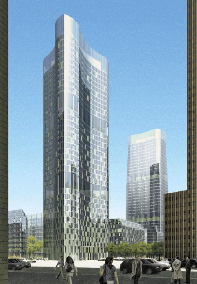 der Karl-Liebknecht-Straße, beides stark frequentierte Verkehrsachsen. Die zwei geplanten Hochhäuser stehen an Ecken und erreichen, gemäß den Vorgaben zur