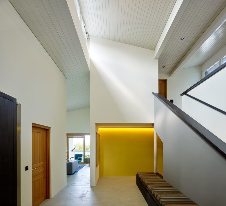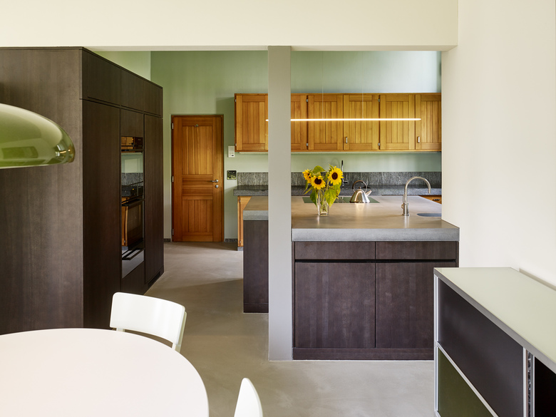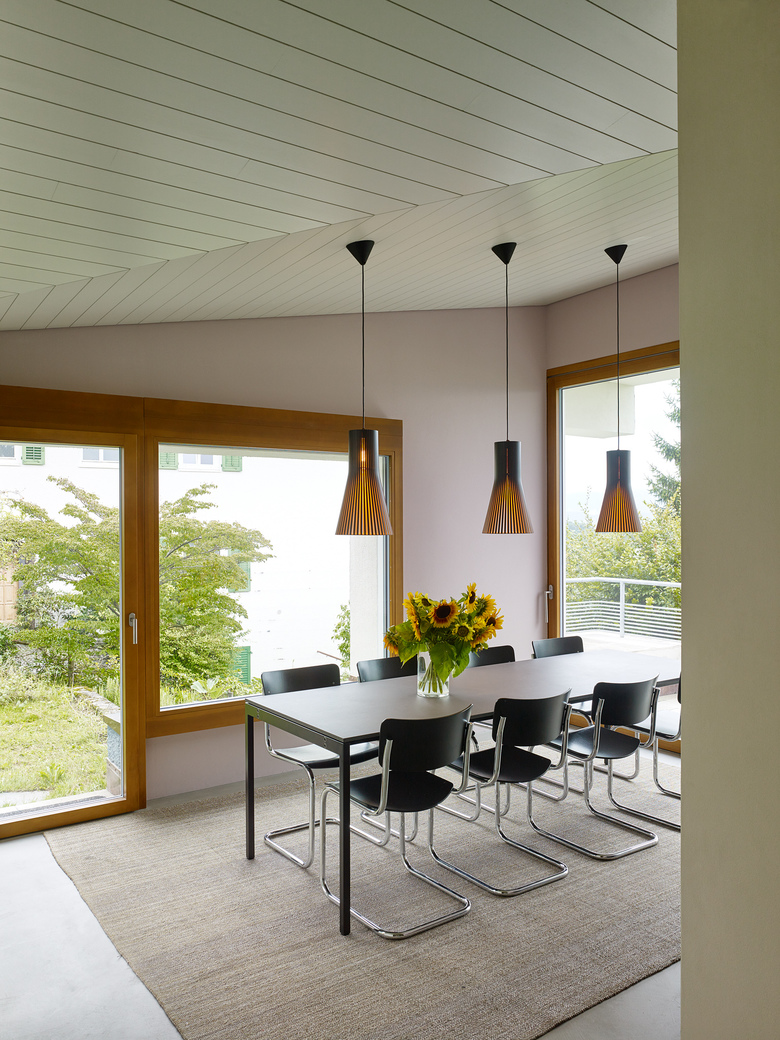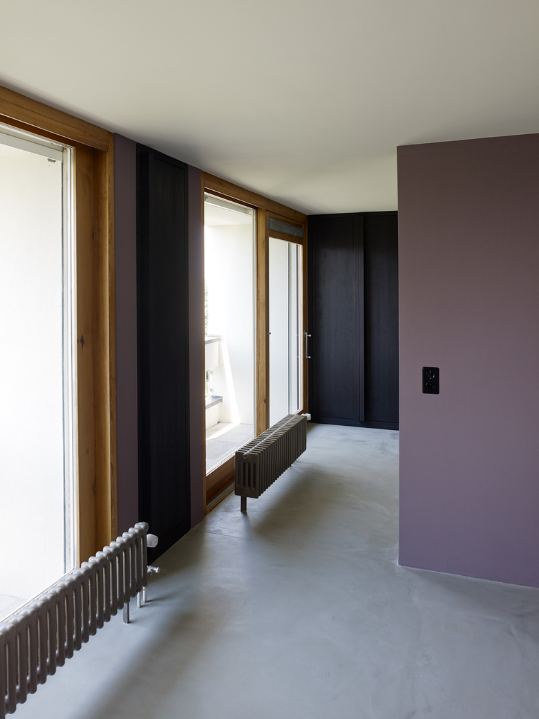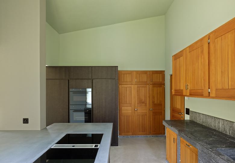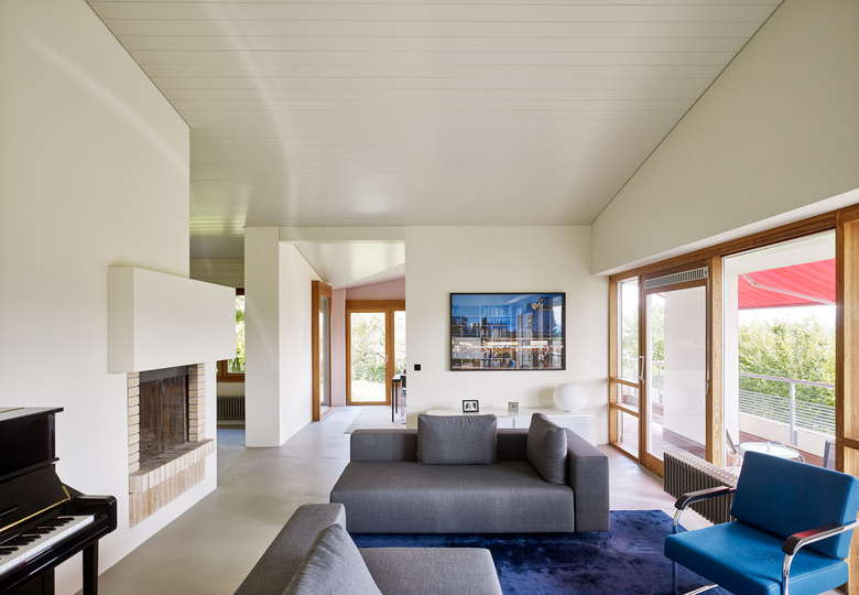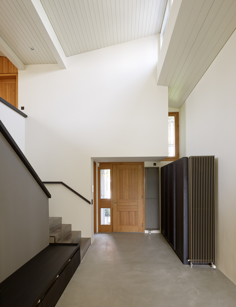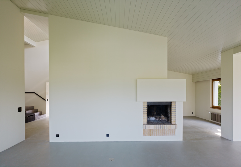 Die ursprüngliche räumliche Anlage - das Haus als Einheit über drei Geschosse - wird durch den Rückbau wiederhergestellt, die zweigeschossige Eingangshalle ins Obergeschoss geöffnet und der Abgang ins Gartengeschoss miteinbezogen. Der gedeckte Aussenraum an der Südwestecke wird als Gartenzimmer dem Wohnbereich zugeschlagen und ausgebaut. Die Kücheneinrichtung wird durch neue Elemente - Kochinsel und Hochschrank - ergänzt.