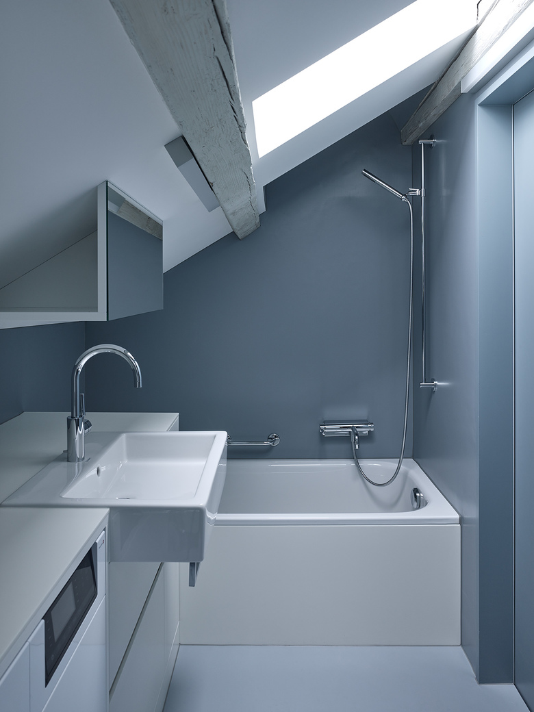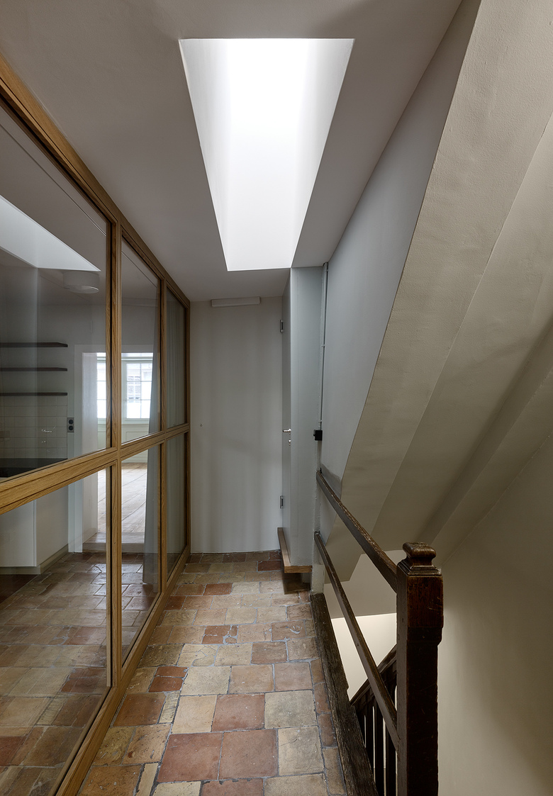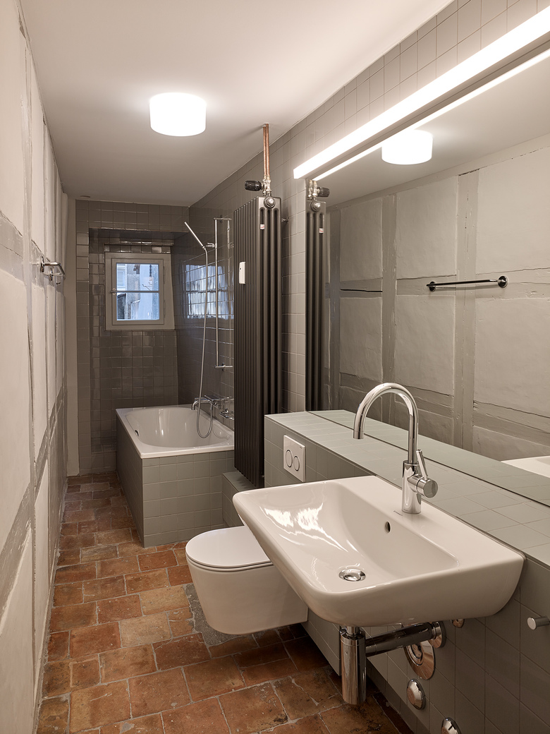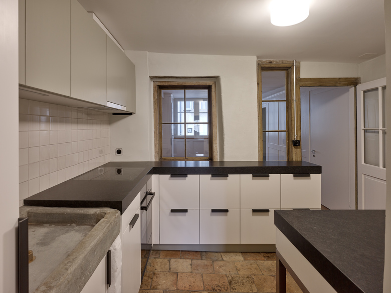 Küche und Bad erhalten durch die neue Ausstattung einen je eigenen Charakter. In der Küche werden die vorhandenen Elemente - im 1. Obergeschoss das historische Steinbecken und die inneren Fenster zu Stube und Entrée - durch die neuen Elemente - massive mineralische Arbeitstische und Einbaumöbel in lackiertem Holz - ergänzt, und bereichern sich gegenseitig zu einem neuen Ganzen. Im Bad bilden der rustikale Boden in Terrakotta und die abstrakten Wände in Keramik - skulptural bestückt mit sanitarischer Ausstattung und ‘Spiegelfenster‘ und gegenüber leergehalten - ein reizvolles Paar.