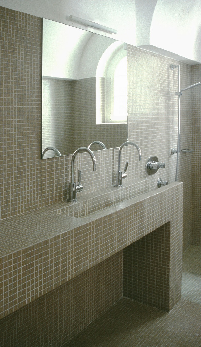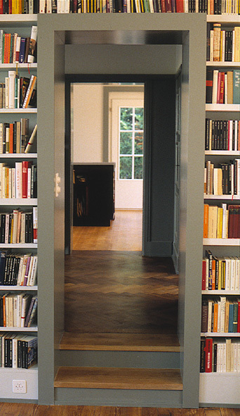 Der vorgefundene Charakter des Hauses ist sehr präsent und umfassend. Bei den baulichen Eingriffen, die nicht sämtliche Räume des Gebäudes betreffen, wird versucht vorhandene architektonische Themen zu übernehmen und neu zu formulieren.