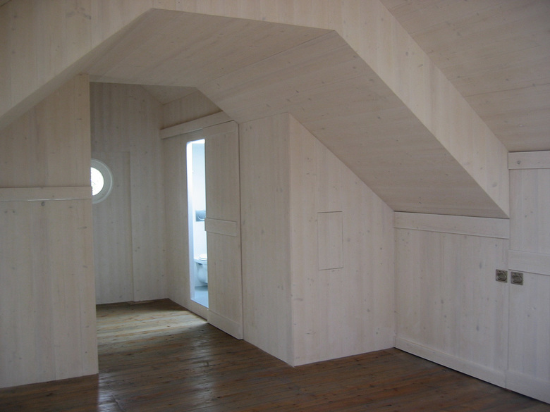 Der Dachraum ist ein spezieller Ort im Haus und soll dies auch bleiben. Der eher rauhe und rohe Charakter des ‚Dachbodens‘ wird in der Materialisierung thematisiert. Der bestehende Tannenriemenboden bleibt erhalten, die Wand- und Dachverkleidung wird in weiss geschlemmten Tannenbrettern ausgeführt. Die direkte und einfache Detaillierung - Horizontalbretter als Aussteifung der Wandtüren, Kistenbeschläge, Kellerarmaturen im Bad - unterstreicht die Gewählte Referenz.