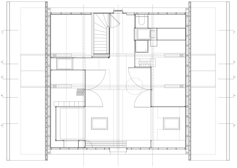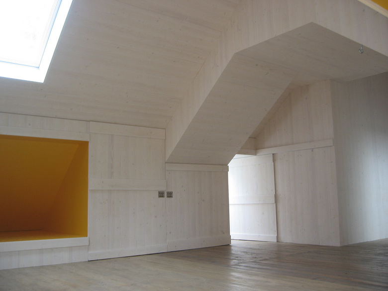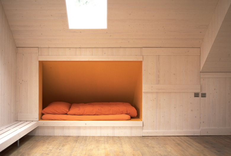 Eine Hülle, Boden - Wand - Decke, kleidet den Dachraum ein und verdeckt das Gebälk. Es entsteht ein Raum im Raum. Durch Öffnungen in der Wand erhält der Raum Nischen mit unterschiedlichen Funktionen: eine Schlafnische, eine Arbeitsnische, ein Stauraum und eine Nische für Dusche und WC. Fenster in der schrägen Dachfläche ergänzen die Nischen. Der ‚Pochet‘-Raum zwischen Verkleidung und Dachschräge dient als Stauraum und wird durch raumhohe Wandtüren erschlossen.