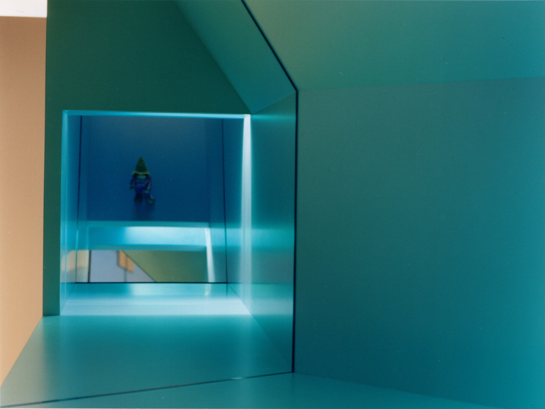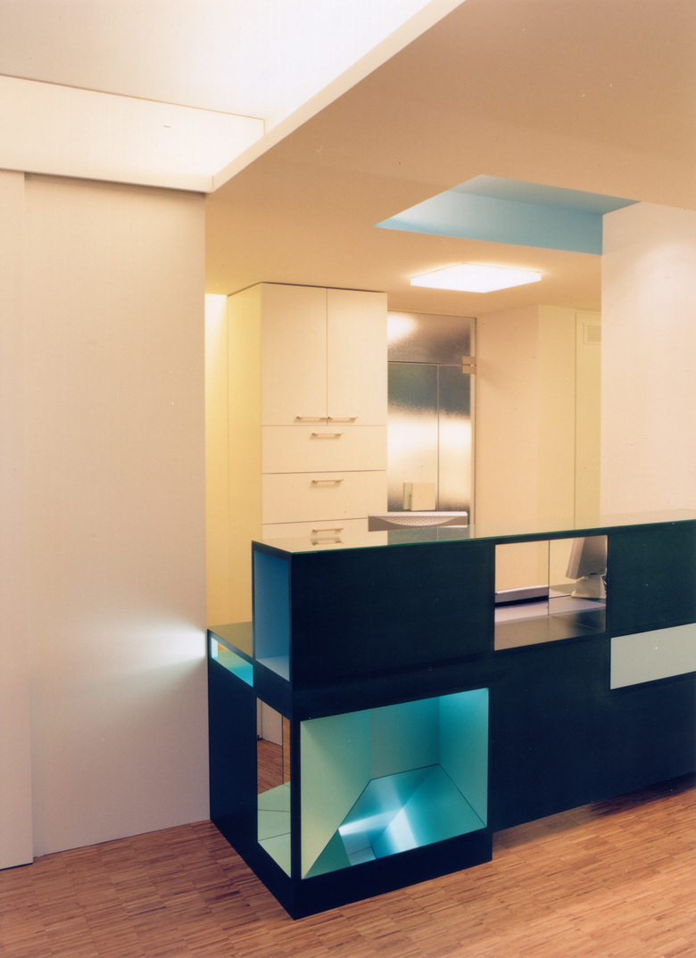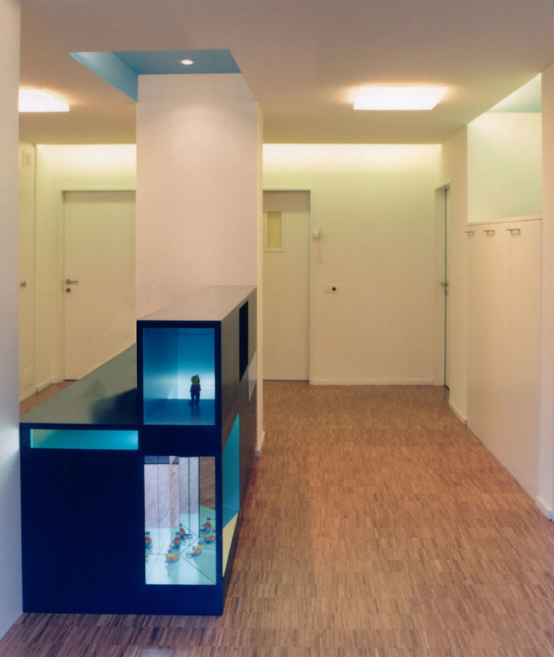 Die Praxis befindet sich im Erdgeschoss eines hundertjährigen Hauses das im Zuge einer Erweiterung ausgekernt und mit einer neuen Raumeinteilung versehen wurde. Im zentralen Raum, wo sich früher das Treppenhaus befand, bildet heute der Empfangsraum das Herz der Praxis. Die Nische als architektonisches Element in verschiedenen Ausformulierungen prägt diesen Raum. Er dehnt sich an den Wänden und der Decke in indirekt beleuchtete farbige Nischen förmlich aus, wodurch eine spannungsreiche Lichtsituation entsteht. Dasselbe architektonische Element - die farbige Raumnische - wiederholt sich motivisch im Empfangskorpus. Zur Miniatur verkleinert und mittels schiefer Spiegelebenen verfremdet, wird es speziell für die kleinsten Gäste zum attraktiven Blickfang. Durchblicke, Einblicke und optische Täuschungen sollen die Neugierde der Kinder auf spielerische Weise anregen.